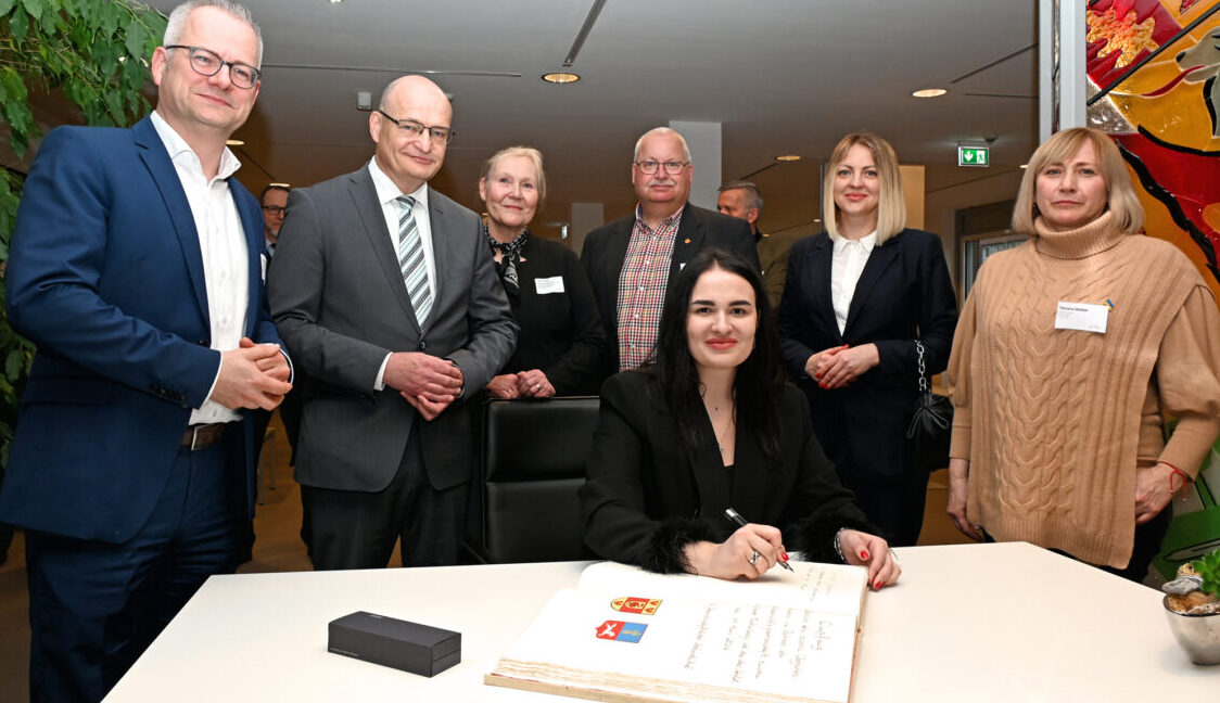 Eröffnet wurde der Empfang durch den Eintrag in das Goldene Buch des Kreises Steinfurt durch Anastasiia Chubina, stellvertretende Bürgermeisterin der Stadt Tscherkassy. Anschließend betonte Landrat Dr. Martin Sommer die Verbundenheit zwischen den beiden Regionen: „Seit mehr als vier Jahren ist die Ukraine den russischen Angriffen ausgesetzt. Tagtäglich leisten Sie bemerkenswerten, mutigen Widerstand und haben die Hoffnung auf einen Frieden dennoch nicht verloren. Ich versichere Ihnen, dass wir den Ukrainerinnen und Ukrainern solidarisch zur Seite stehen, so lange es notwendig ist.“ Auch Anastasiia Chubina drückte Respekt und Dankbarkeit für die Partnerschaft aus, durch die bereits wichtige Projekte zur Unterstützung der Bevölkerung in Tscherkassy umgesetzt wurden. Dazu zählen Hilfslieferungen mit Schulausrüstung oder Hospitationen ukrainischer Ärzte im Klinikum Ibbenbüren. Über mögliche folgende Hilfsmaßnahmen tauschten sich die Beteiligten aus Tscherkassy und dem Kreis Steinfurt bei einem gemeinsamen Abendessen aus, mit dem die Partnerschaft nach dem offiziellen Teil des Empfangs weiter gestärkt wurde.