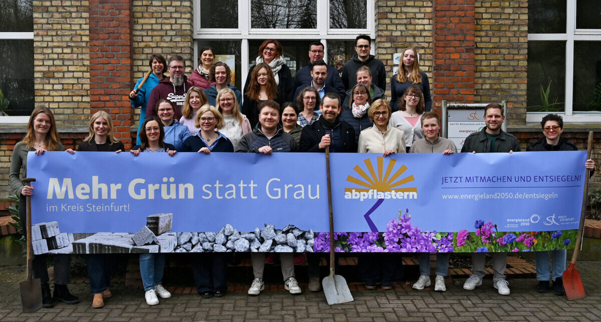 Der bundesweite Entsiegelungswettbewerb „abpflastern“ geht in eine neue Runde. Ab sofort sind auch im Kreis Steinfurt Bürgerinnen und Bürger, Vereine, Schulen, Unternehmen und Kommunen aufgerufen, versiegelte in begrünte Flächen umzuwandeln und das Ergebnis unter www.abpflastern.de einzureichen. Bis zum 31. Oktober 2026 können erfolgreiche Maßnahmen durch Vorher-Nachher-Fotos in einem Online-Portal eingetragen werden, über das die Zuordnung zur jeweiligen Kommune erfolgt. Auch der Rückbau von Schotterflächen wird gewertet. Nach dem Ende des Wettbewerbs werden die Städte und Gemeinden ausgezeichnet, die in der bundesweiten Rangliste vorne liegen. Der Kreis Steinfurt läutete jetzt gemeinsam mit den kreisangehörigen Städten und Gemeinden die neue Wettbewerbssaison ein.