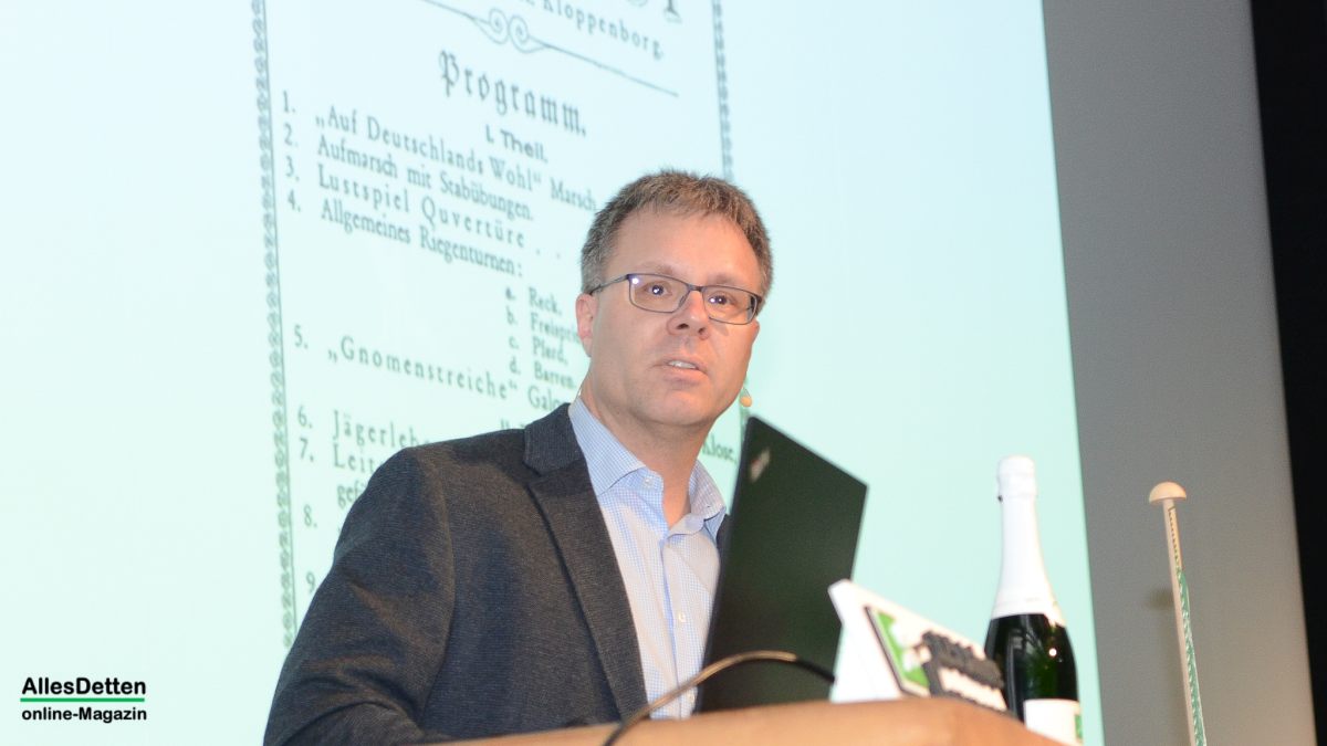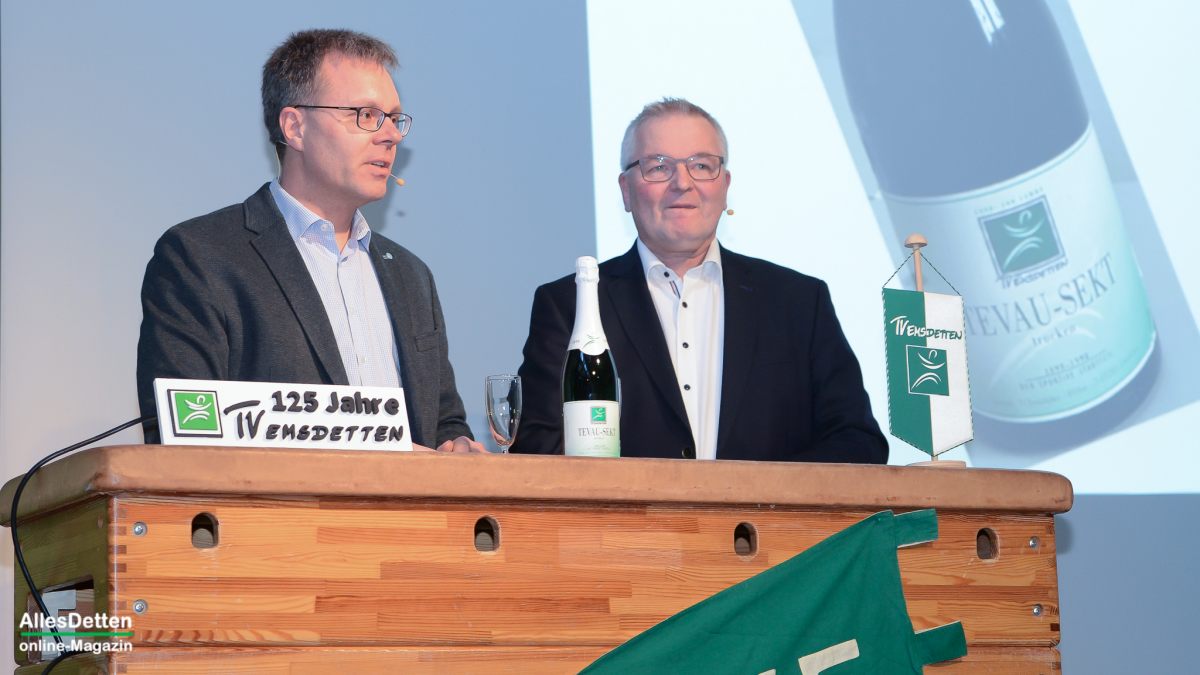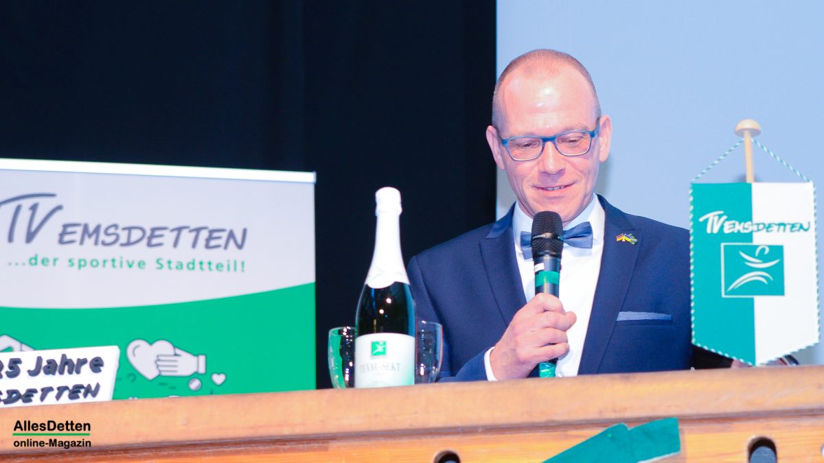 Stefan Akamp gab zwischen den Grußworten immer wieder einen Einblick in die Historie des Turnvereins, stellte eine Flasche Sekt vor sich, die extra für das 100-jährige Jubiläum vor 25 Jahren aufgelegt worden war, zeigte, wie Stempel und Logo sich im Laufe der Zeit verändert haben. Er berichtete, dass man, als es noch keine Turnhallen gab (erste Turnhalle in Emsdetten war die an der damaligen Wilhelmschule, erbaut 1936), in Wirtshaussälen trainiert wurde. Da Wirtshäuser in aller Regel auch Theken haben, fiel das eigentliche Training auch schon mal kürzer aus.