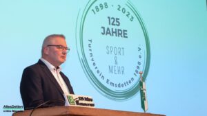 Anlass war der offizielle Festakt des Turnverein Emsdetten 1898 e.V. am Samstag im Bürgersaal von Stroetmanns Fabrik. Präsident Dirk Kersting und 1. Vorsitzender Stefan Akamp hatten eingeladen und begrüßten die erschienenen Gäste.