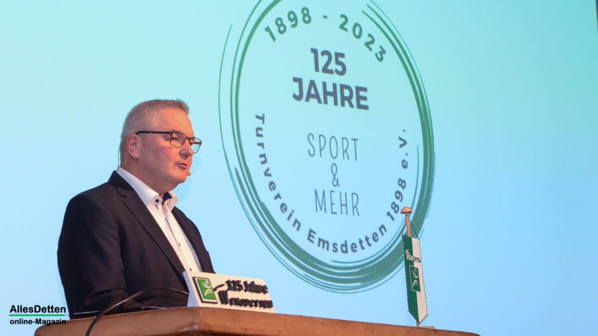 Zu den Gratulanten auf dem Podium gehörte die stellvertretende Landrätin Gisela Lang, Stefan Klett (Präsident des Landessportbundes NRW) ließ sich entschuldigen, hatte aber eine Botschaft geschickt, Martin Schmale (Vize-Präsident des Westfälischen Turnerbundes), Stefan Kippe (Vorsitzender des Kreissportbundes), Julian Lagemann (Vizepräsident Kreissportbund Steinfurt und Vorstandsmitglied der Deutschen Sportjugend), Ralf Lammert (Vorsitzender des Stadtsportverbandes Emsdetten). Die Landtagsabgeordnete Andrea Stullich (CDU) ebenso wie die Mitglieder des Deutschen Bundestages Jürgen Coße (SPD), Jan-Niclas Gesenhues (Die Grünen) und Kathrin Vogler (Die Linke).