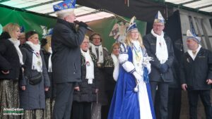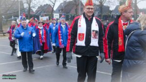 Pünktlich um 13:11 Uhr zog dann mit dem Sinninger Spielmannszug voran, die KGE auf. Der künftige Prinz Tobias I. und Prinzessin Jessica I. (die Proklamation ist erst am kommenden Samstag) , der Stadtelferrat 2026 mit dem Präsidenten-Duo Tim Neumann und Britta Jürgens an der Spitze, das noch amtierende Prinzenpaar Jochen I. und Marion II., eine Abordnung der Prinzengarde mit Kanzler Alfred Tecklenborg sowie eine Abordnung des KGE-Vorstandes mit den Präsidenten Martin Mersmann und Thomas Weischer. Zur liebgewonnenen Tradition ist es geworden, dass jeweils der Vorjahreselferrat, also in diesem Fall der Elferrat 2025 mit Präsident Markus Frieling an der Spitze, beim Einzug Spalier steht.