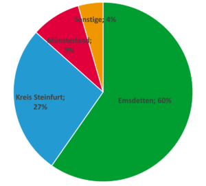 Den regionalen Schwerpunkt setzen dabei traditionell die Emsdettener Unternehmen mit einem Zuwachs auf 60% (+5%-Punkte). Die Regionalität wird unterstrichen durch die Aussteller aus dem Landkreis Steinfurt mit nun 27% (+2%).