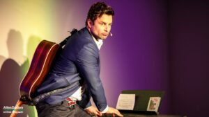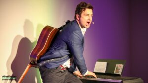 Er findet in Barbara in der ersten Reihe schnell eine Ansprechpartnerin die während des gesamten Abends immer mal wieder herhalten muss. Dialoge werden mit „Siri“ geführt. Der aus Berlin stammende Redlich besingt sein erstes Date mit einer Veganerin, muss dafür vorher seine Wohnung präparieren: das Hirschgeweih muss weg, die Couchgarnitur aus echtem Leder darf ihr nicht ins Augen fallen, „Fruchtfliegen sind ok!“. – Für diesen Song hat er dann gleich drei Variationen parat: a) im Stile von Rosamunde Pilcher, b) die Markus-Lanz-Version oder c) „Tatort“ – allerdings mit noch mehr Blut. Barbara darf entscheiden und wählt C. Natürlich darf sich das Publikum anschließend auch noch bei A + B kringeln vor Lachen.