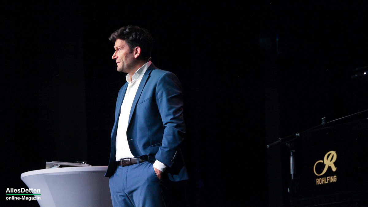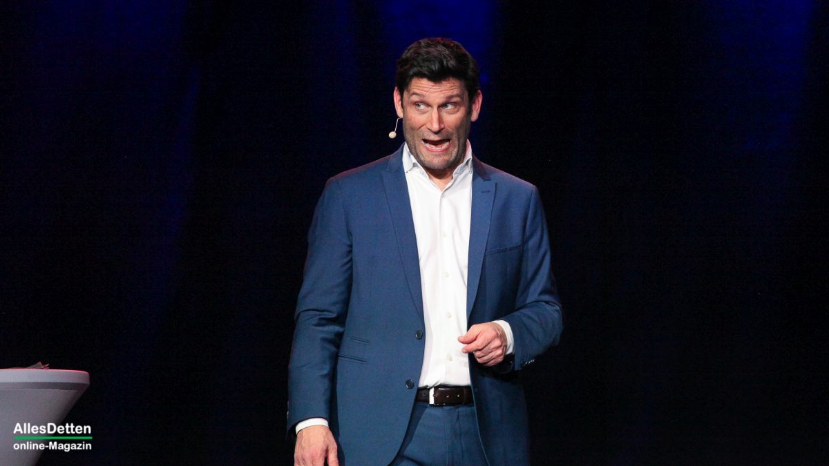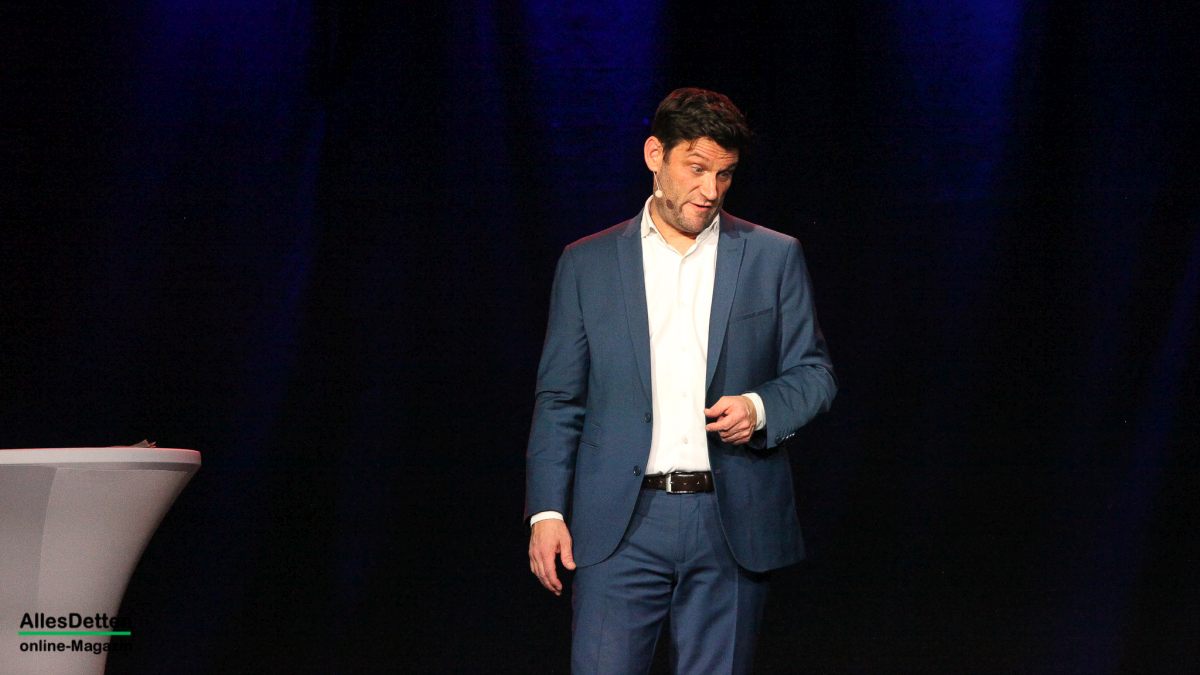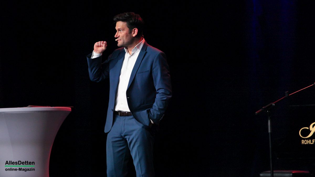 Das heißt, nicht ganz – er überlässt dann schon den über 500 Menschen im Saal die Auswahl der Themen. Da kommen Begriffe wie Klimawandel, Fahrräder in der Fußgängerzone, Verbrennerverbot, Kirche, Putin, Trump, Bildung – Themen, die er von nun an in sein laufendes Programm einbaut und am Ende feststellt, dass er seine to-do-Liste abgearbeitet hat.