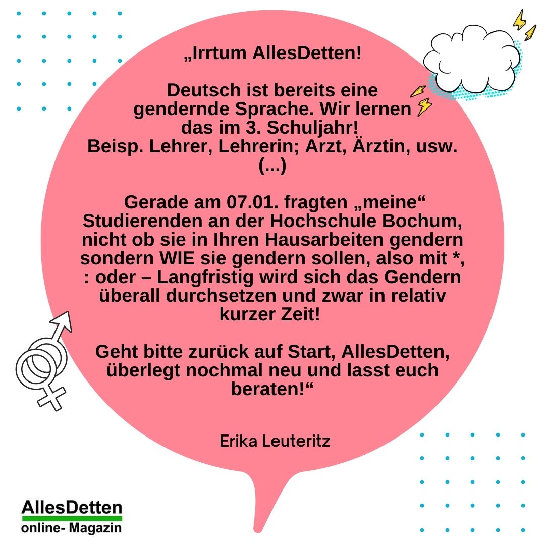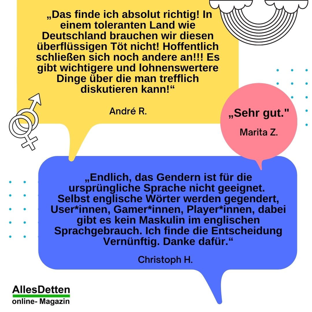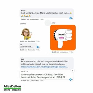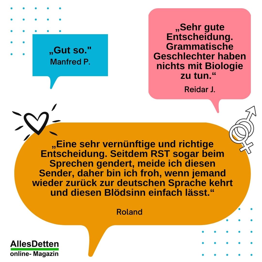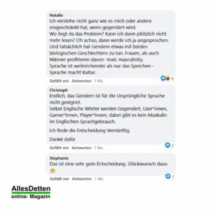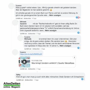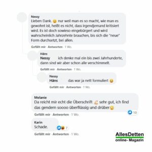 „Danke für diese Reaktion an allesdetten.de. Das ist auch ein Gedankengut, welches sich auch andere Medien u. Beratungskreise nicht zu schade sein sollten. Ich lehne jedes Gendern ect. vehement ab (auch Werbung) und verzichte auf Käufe/Abbos/Geschäfte dieser Spracherfindung. Wem das nicht passt kann mich gerne aus der Freundesliste/Kundenkartei streichen…. bevor ich das mache.“