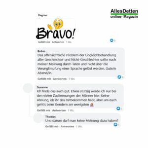 In der vergangenen Woche ging es hoch her bei AllesDetten. Das abgegebene Statement unserer Redaktion zum Thema „Gendern“ in redaktionellen Texten hat für einige Diskussionen gesorgt. „So viel geballte Rückmeldung hatten wir zuletzt bei den Kommunalwahlen 2020.“
