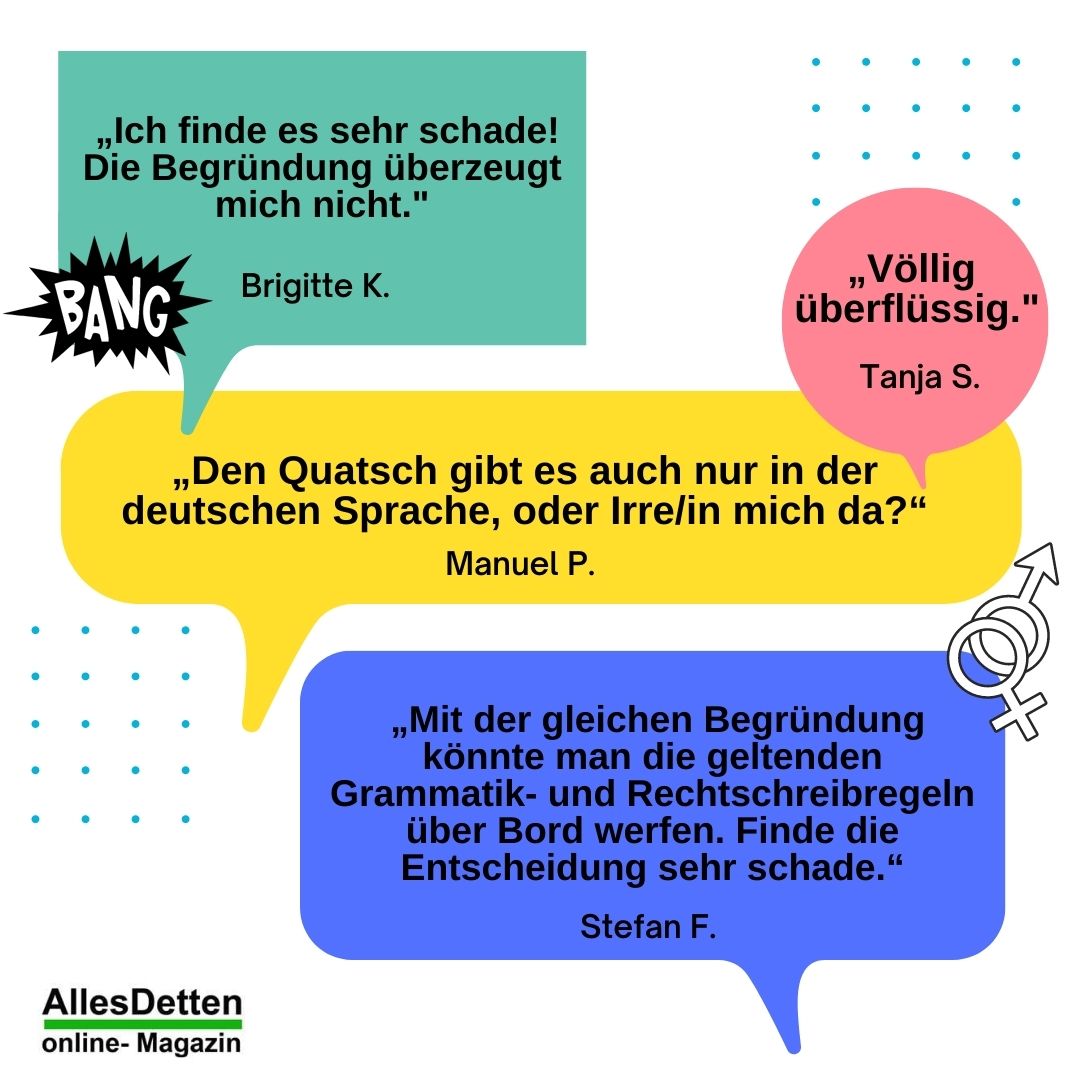 Unser Leser Thomas S. fühlt sich durch die Entscheidung ebenfalls in seiner Sichtweise bestätigt und kommentiert unter dem betreffenden Bericht: „Das ist sehr gut und entspricht genau meiner Ansichtin“ und parodiert durch seine Wortneuschöpfung die Ausmaße, die das Gendern mitunter mit der Sprache annehmen kann. Ein klares Statement zum geschlechtsspezifischen Abändern der Sprache kam auch von Rolf S.: