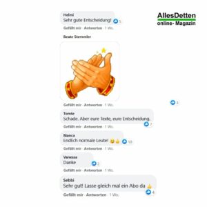 Generell teilen wir unsere AllesDetten- Berichte auch in den sozialen Medien, insbesondere auf Facebook hatte der besagte Bericht für einige Interaktionen gesorgt. Ein paar aussagekräftige Kommentare haben wir euch herausgesucht: