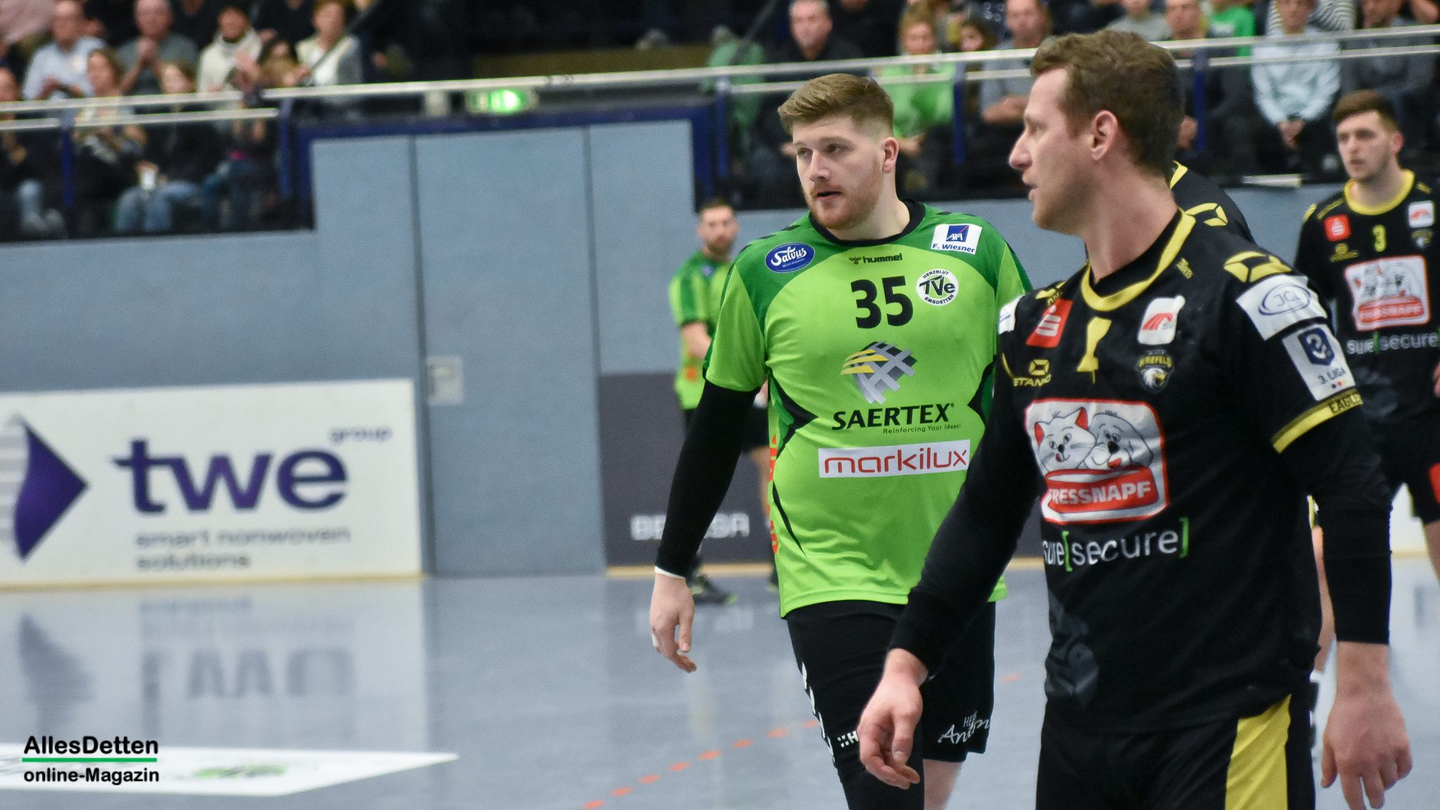 Die Schiedsrichter spielten fleißig mit, verteilten die Zeitstrafen auch an den Bänken. Sascha Bertow zeigte Emotionen, wurde dafür bestraft. Auch die Krefelder Hahn, Noll und Schmetz wurden vom Duo an der Pfeife mit Strafen bedacht. Vier Minuten vor dem Ende wurde Trainer Mark Schmetz dann ganz aus dem Innenraum verwiesen. Die rote Karte bedeutete für ihn, nicht mehr persönlich in das Geschehen eingreifen zu können. Eine abwertende Bewegung reichte für die Hinausstellung. Niemand brauchte diese rote Karte. Dass der Ballbesitz, auf Anweisung der Zeitnehmer dann zu den Gästen wechselte kann auch am Tag danach bisher niemand sachkundig erklären. Die TVE Spieler waren zum Angriff aufgestellt und mussten nach der Bestrafung des Gästetrainers den Ball auf Anweisung der Zeitnehmer abgeben. Wer das erklären kann, darf uns gern eine Email an sport@allesdetten.de zukommen lassen.