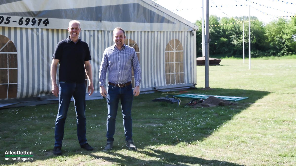 Festausschussvorsitzender Jochen Plugge und auch Schirmherr Peter Fehlings sind an diesem Morgen mit AllesDetten vor Ort. Es ist deutlich erkennbar, was hier am Wochenende stattfinden wird, aber eben noch nicht alles fertig. Allein für den Kommers am Freitagabend liegen rund 750 Anmeldungen vor. Das Festzelt musste also kurzfristig erweitert werden, da man im Anfang doch mit mehr Absagen gerechnet hatte. „Die Leute haben Lust, die wollen wieder raus.“ Und wenn die Wetterprognosen Recht behalten, dann macht eine gelbe Sonne am blauen Himmel den Festplatzschmuck perfekt.