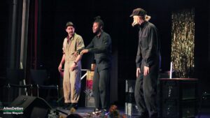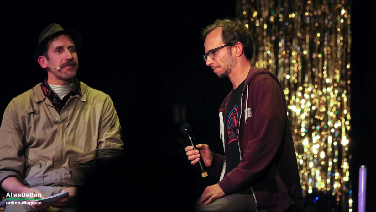 Bei der anfänglichen Frage, wer Baddabäm! denn schon kennt, schon einmal eine Show mitgemacht hat, gingen verhalten einige Hände hoch, der ganz große Großteil der etwa 300 Zuschauer am Samstagabend im Bürgersaal von Stroetmanns Fabrik war erstmals hier und das ganz sicher in vielen Teilen mit anderen Erwartungen als das, was hier jetzt geboten werden sollte. Der Titel „Baddabäm!„, die Begriffe „parapolitische Abendunterhaltung„, „weltweit erste und einzige Bühnenshow zwischen Kunst, Journalismus, Wissenschaft und Politik“ sind Schlagworte, die sich Satire-Magazine gerne mal auf die Fahnen schreiben, Kabarett, einige sind beim Ticketkauf möglicherweise von einer Art „extra-3-light“ ausgegangen. – Sie wurden überrascht, aber nicht enttäuscht.