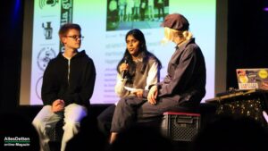 Schüler der MartinumMedia aus Emsdetten stellten ihr Projekt vor. Eine Schülerfirma, die tatsächlich auch Aufträge aus der freien Wirtschaft erhält, die sich selber organisiert, von der künstlerischen Gestaltung der Videos, die dann von Firmen für Promotion-Zwecke genutzt werden, bis hin zur Buchhaltung und die kaufmännischen Belange eines Wirtschaftsunternehmens.