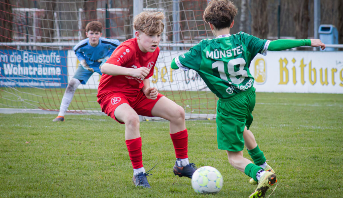 Dass an diesem Spieltag die Serie von sieben ungeschlagenen Spielen in Gefahr geraten könnte, war angesichts des Gegners durchaus erwartbar. Weniger erwartbar war, dass Borussias D1 die Gäste aus Münster in der ersten Halbzeit nicht nur im Griff hatte, sondern auch höher hätte führen können. Berreits nach drei Minuten klaute Titus Sander den Münsteranern im Mittelfeld den Ball und lief alleine aufs Tor zu, verfehlte jedoch knapp. Zehn Minuten später war es wieder Sander, der den SCP-Schlussmann prüfte und mit einem Distanzschuss scheiterte. Münster blieb zunächst harmlos, eine Chance in Minute 17, mehr war nicht zu sehen. Für Unterhaltung sorgten die Dettener. In Minute 18 flog ein weiterer Versuch von Sander am langen Pfosten vorbei, ehe eine weitere Minute später die verdiente Führung fiel. Nach einer Ecke nickte Bennet Schmitz zum 1:0 ein. In der Folge verflachte die Partie, beide Teams blieben intensiv in den Zweikämpfen und gaben wenig Raum und Zeit für Kombinationsspiel.