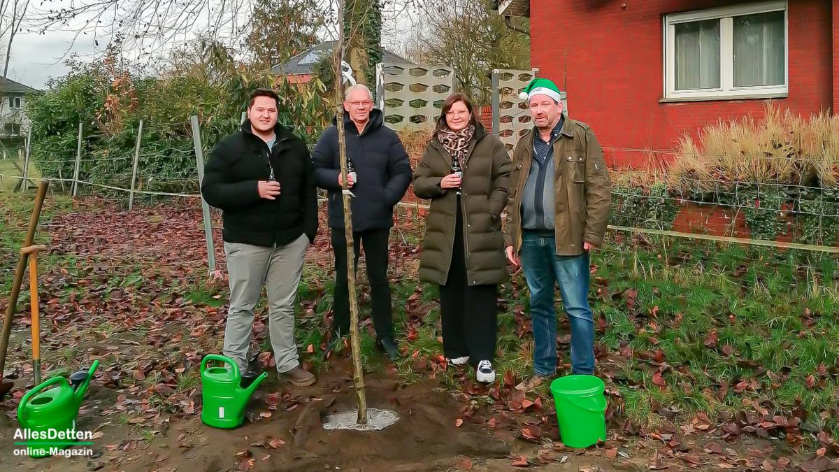 Es ist schon eine Weile her, da grassierte die Baumpflanz-Challenge durch die sozialen Netzwerke. AllesDetten wurde seinerzeit von der Gemeinschaft Emsdettener Spielmannszüge (GES) nominiert. Wir hatten dann darauf hingewiesen, dass der Sommer der falsche Zeitpunkt sei, um Bäume zu pflanzen. Jetzt haben wir unser Versprechen eingelöst, der Termin wurde nachgeholt, zusammen mit Vertretern aus dem GES-Vorstand. Es wird noch ein oder zwei Sommer dauern, bis der Baum Früchte trägt, spätestens dann aber können alle gerne wieder zur Ernte zusammenkommen.