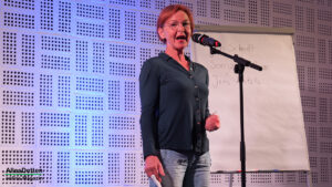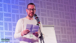 Jetzt aber zu den Künstlern, die aus Oerlinghausen und Düsseldorf angereist sind um zu liefern! Sonja Weidhase und Jan Schmidt einigten sich im Vorfeld darauf „Wir machen keinen Wettbewerb!“ Das „Goldene Weberschiffchen“ bleibt also bis zur nächsten Ausgabe in der Obhut von Joschy Wolters. Die Texte, die Weidhase und Schmidt vorgetragen haben, hätten unterschiedlicher nicht sein können. Eine Mail an das Internationale Olympische Komitee (IOC), warum PoleDance olympische Disziplin werden solle, hat es doch in der Geschichte schon weitaus fragwürdigere Wettbewerbe gegeben. Ein Bericht über Deutschlands Bahnhöfe, die oftmals den ersten Eindruck der jeweilige Stadt vermitteln und man hier einfach nur maximal umsteigen möchte. Der Alltag einer Lehrerin mit durchaus systemkritischen Aspekten oder auch wie die digitalen Medien mittlerweile den Tagesablauf bestimmen.