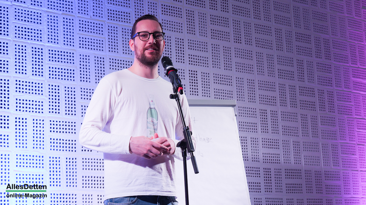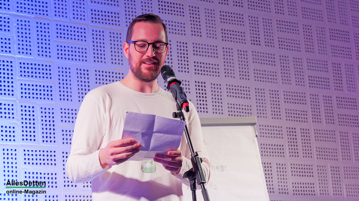 In Erinnerung an den „Dichthof 2025“, einige Anwesende waren seinerzeit dabei, sprach Kotalla von einem „Fluch der über Emsdetten lag“. Damals hatte ein im Vorfeld angekündigter Künstler seinen Auftrirtt schlichtweg vergesssen. Dumm gelaufen, kann passieren. Im nächsten Atemzug musste der Moderator aber dann gestehen: „Der Fluch, der über Emsdetten lag, liegt noch immer über Emsdetten.“ Soll heißen, auch ein für heute vorgesehener Künstler hat vergessen, dass er eigentlich jetzt in Emsdetten auf der Bühne stehen sollte.