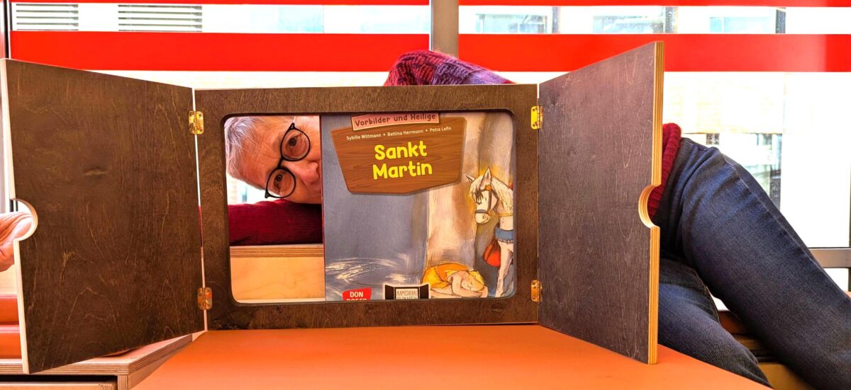 Dagmar Linke bringt für ihre nächste Vorlesestunde für die Allerkleinsten im Alter von zwei bis drei Jahren das Kamishibai-Erzähltheater „Sankt Martin“ mit. Die bekannte Heiligen-Legende wurde kindgerecht illustriert von Petra Lefin und nacherzählt von Bettina Herrmann und Sybille Wittmann: