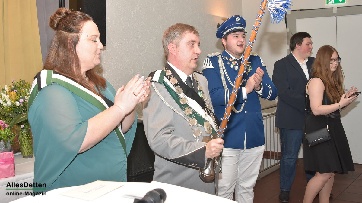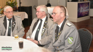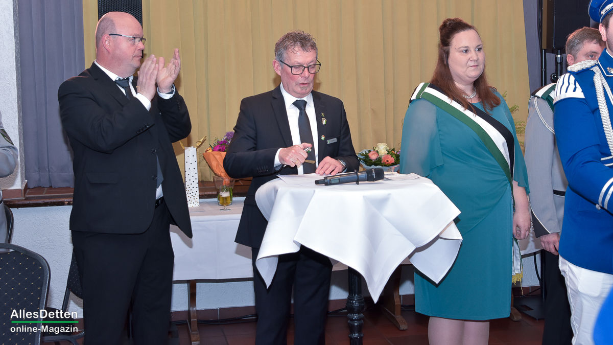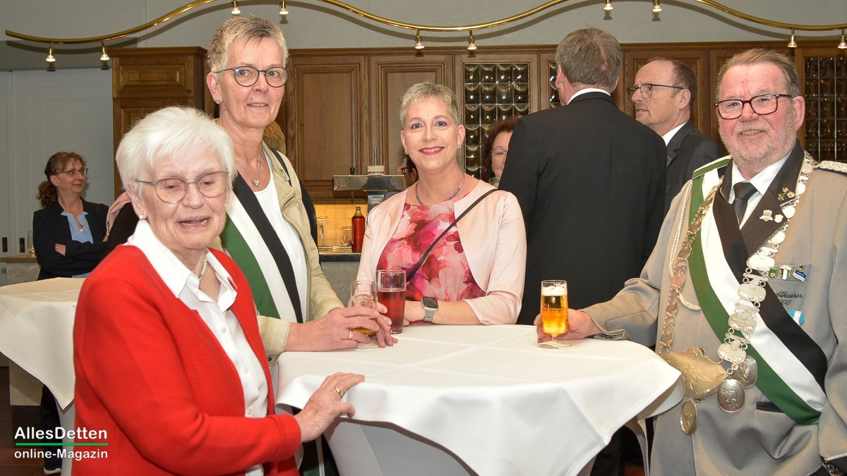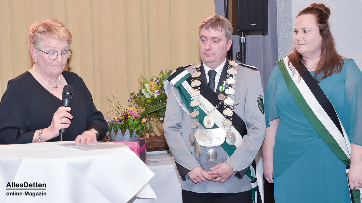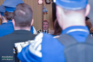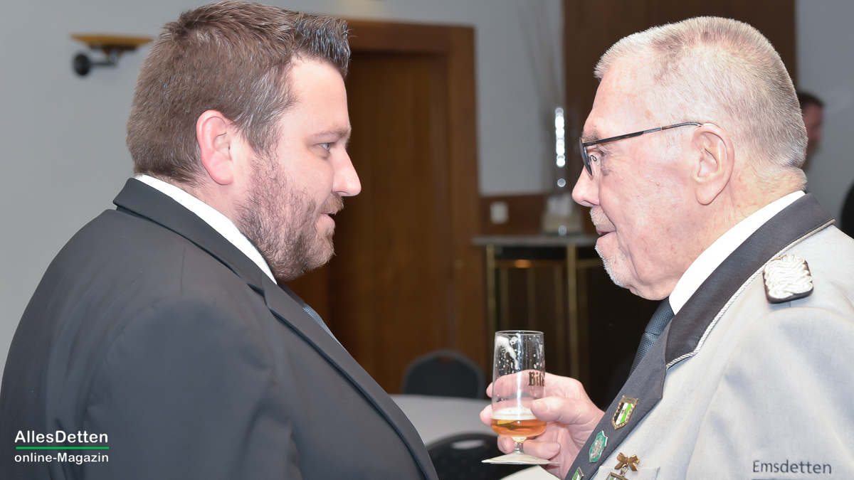 Die Gästeliste des Abends, die Vereinigten-Vorsitzender Rainer Müllmann zuvor begrüßt hatte, schien fast unendlich lang zu sein. Da waren die ehemaligen Stadtkaiser und -kaiserinnen, der Spielmannszug der WEstumer Schützengesellschaft brachte ein Ständchen, die Stadt Emsdetten war vertreten durch die stellvertretende Bürgermeisterin Martina Rüschenschmidt, und erstem Beigeordneten Elmar Leuermann. Rüschenschmidt lies es sich nicht nehmen, Grußworte in Vertretung des Bürgermeisters auszubringen.Die Vertreter der politischen Parteien im Rat der Stadt Emsdetten, Familie und Freunde des Kaiserpaares waren dabei. Vertreter der Westumer Schützengesellschaft und des Bürgervereins Hembergen. Vertreter der Vereinigten Schützengesellschaften Greven, unter anderem der Grevener Stadtkaiser, der ebenfalls einige Grußworte an die anwesenden Schützenbrüder und -schwestern richtete. Die KGE hat eine Abordnung geschickt, der Vorstand der Vereinigten Schützengesellschaften. Der Festausschuss des bevorstehenden Bundesfestes und nicht zuletzt AllesDetten sowie Vertreter weiterer Emsdettener Medien.