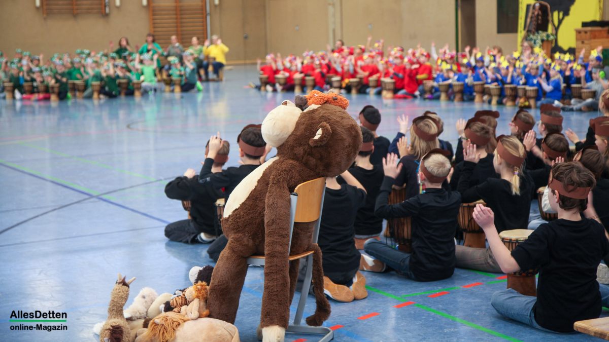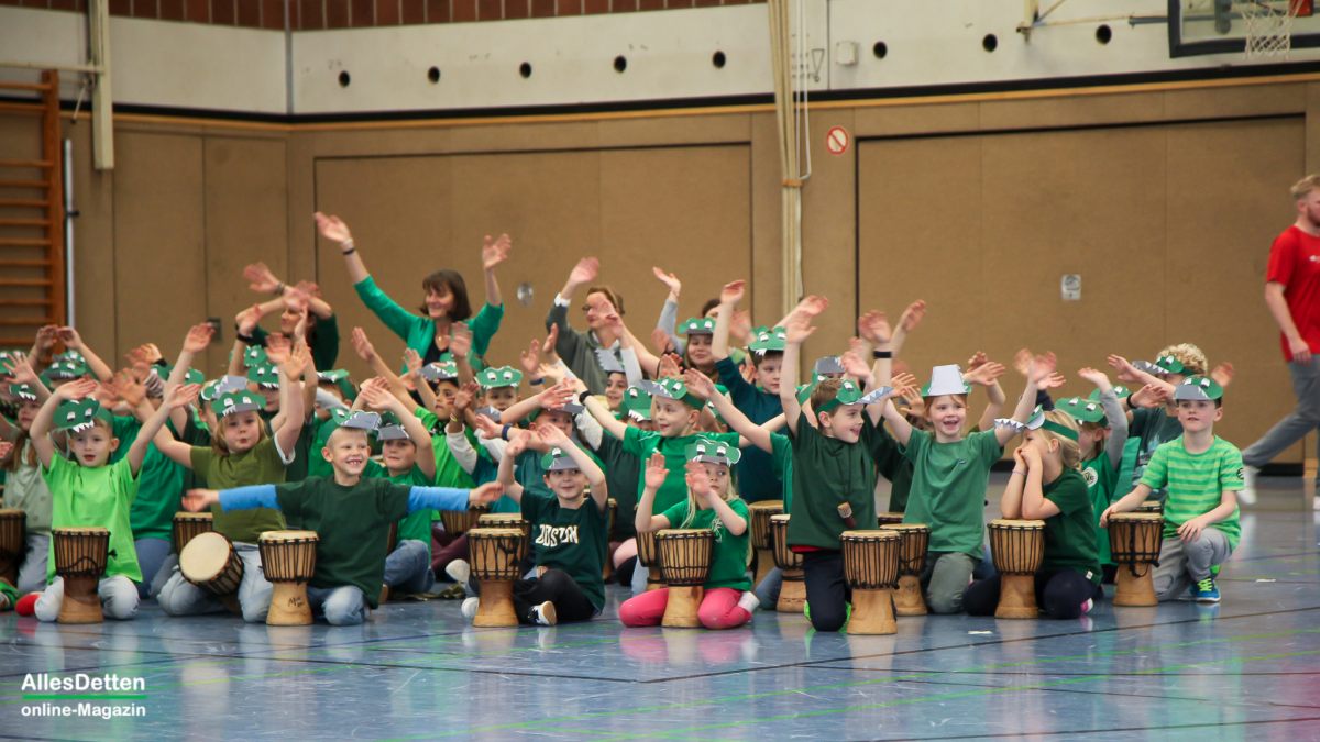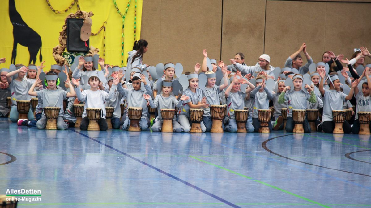 Fast 300 Kinder, fast 300 Trommeln und über 600 Zuschauer in der Euregio-Halle, die kurzerhand zur afrikanischen Savanne umfunktioniert wurde. Die Projektwoche der Schule Hollingen (wir berichteten bereits H I E R) zum Thema Afrika, hatte ihr großes Finale erreicht. Schülerinnen und Schüler aller vier Jahrgänge führten das kleine Musical auf, welches in den vorausgehenden vier Tagen einstudiert wurde.