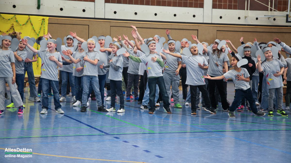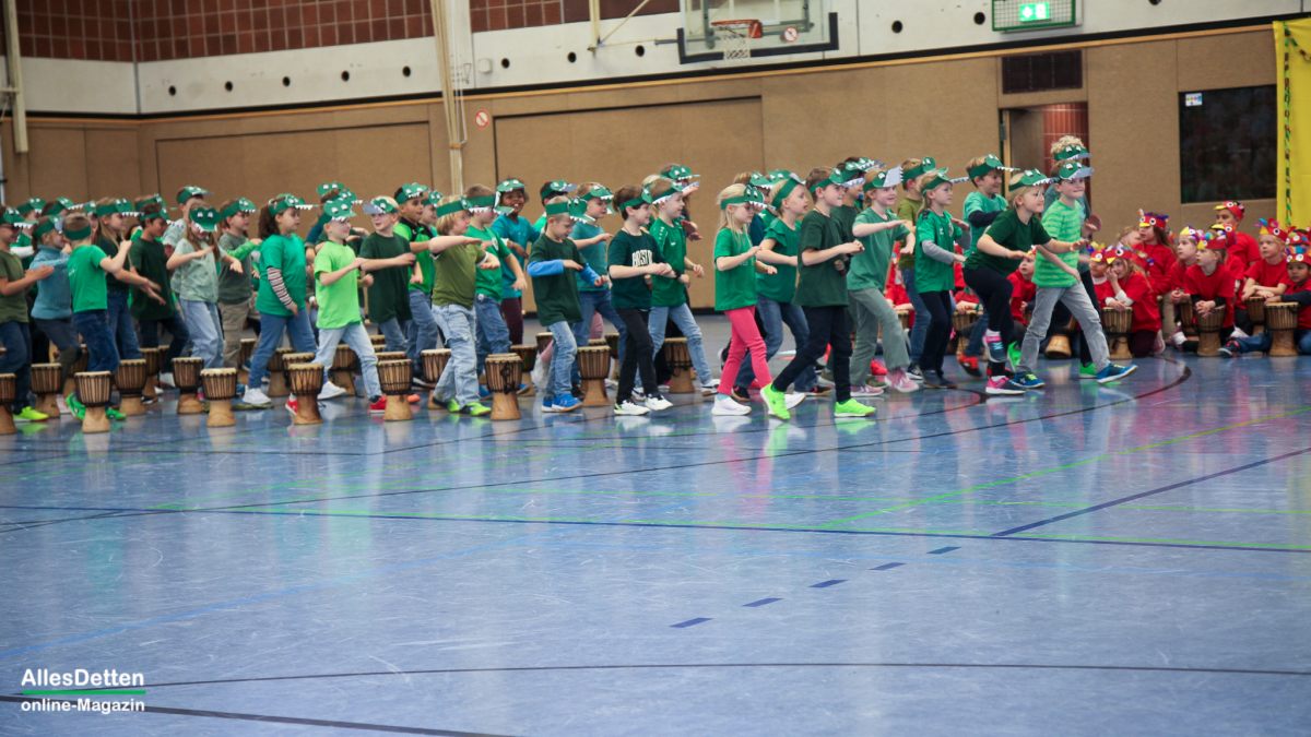 Fast 300 Kinder, fast 300 Trommeln und über 600 Zuschauer in der Euregio-Halle, die kurzerhand zur afrikanischen Savanne umfunktioniert wurde. Die Projektwoche der Schule Hollingen (wir berichteten bereits H I E R) zum Thema Afrika, hatte ihr großes Finale erreicht. Schülerinnen und Schüler aller vier Jahrgänge führten das kleine Musical auf, welches in den vorausgehenden vier Tagen einstudiert wurde.