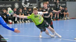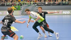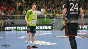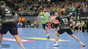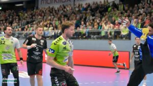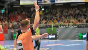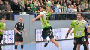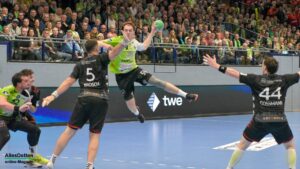 Nun war der Bann gebrochen. Bis auf 9:3 Tore zogen die Spieler im grünen Dress davon. Inklusive einem Torhüter Oliver Krechel, der seinen Kasten so gut es ging sauber hielt. Ihm half, dass seine Vorderleute in der Deckung bis in die Haarspitzen motiviert waren und meistens verhindern konnten dass Gäste in gute Abschlusspositionen kamen. Etwas ärgerlich: Die eigenen Überzahlsituationen konnte unser Team nicht in Zählbares umsetzen. Der ASV Hamm fing sich mit zunehmender Spielzeit. Spätestens nach der zweiten Auszeit von Gästetrainer Jamal Naji waren die ASV Akteure auf Ballhöhe und der erwartet schwere Gegner. Zur Halbzeit stand eine verdiente 13:10 Führung für Emsdetten auf der Anzeigetafel.