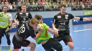 Der zweite Durchgang war das erwartet heiße und umkämpfte Derby in einer mit 2.200 Zuschauern ausverkauften und kochenden EMS-Halle. Wenn der TVE mal wieder etwas weg zog, legte Hamm gleich nach und spielte sich wieder an die Schützlinge von Emsdettens Trainer Lennart Lingener heran. Hier agierten jetzt zwei Teams auf Augenhöhe. Und die schenkten sich nichts! Beim Stand von 28:25 musste Gästespieler Jan Brosch mit seiner dritten Zeitstrafe vorzeitig und unfreiwillig in den Feierabend gehen. Das nutzte Emsdetten um nach Marius Kluwes Treffer zum 31:25 einmal mehr in Führung zu gehen. Kurz darauf war auch für TVE Rückraumspieler Akos Szeles Feierabend. Der Gegenspieler war bereits vorbei als er noch einmal zulangte und dafür die rote Karte sah. Keine böse, aber unnötige Aktion des Ungarns. Der ASV Hamm warf in der Schlussphase noch einmal alles in die Partie und erzwang eine kleine Aufholjagd, die sie noch einmal bis auf zwei Tore auf 34:32 heran brachte. Detten agierte cool, wusste das dem Gegner die Zeit ausging. Mit dem Abpfiff rissen die Spieler die Arme in die Höhe, und die EMS-Halle sang gemeinsam „Oh, wie ist das schön!“ Recht hatten sie: Ein ganz großes Spiel zweier wirklich toller Teams. Und ein Derbysieg für den TV Emsdetten!