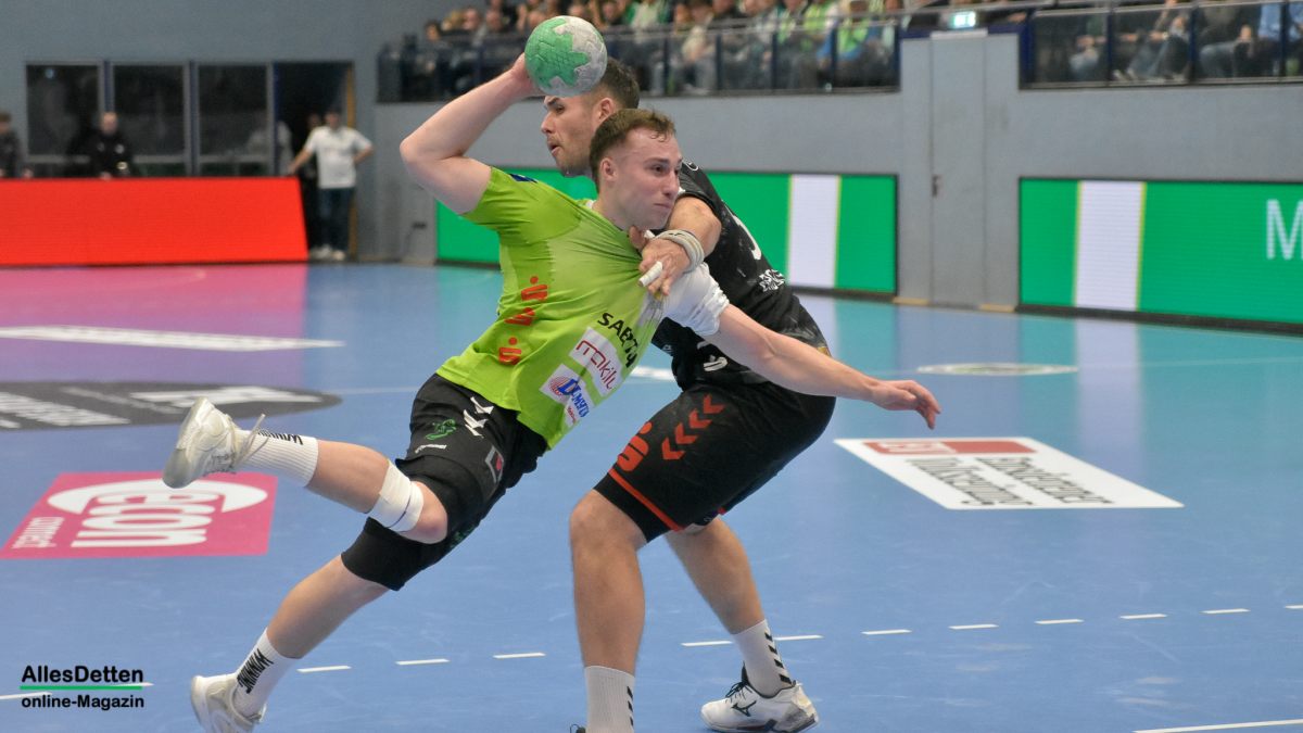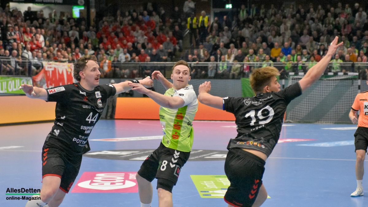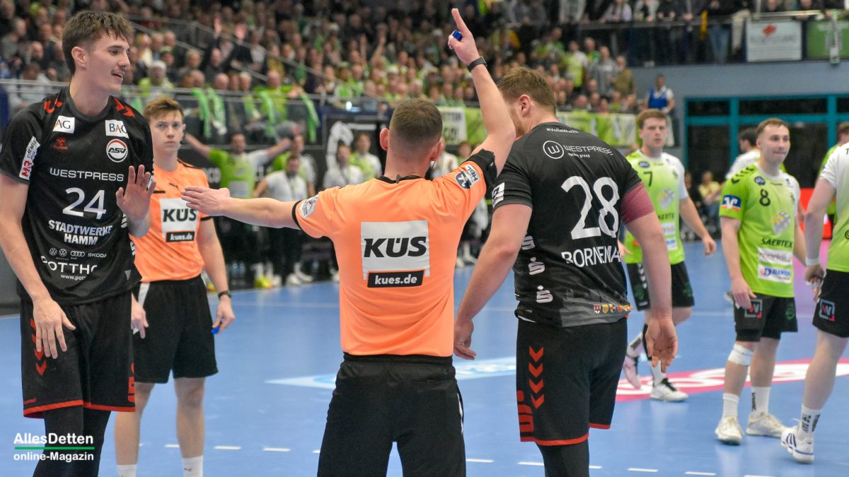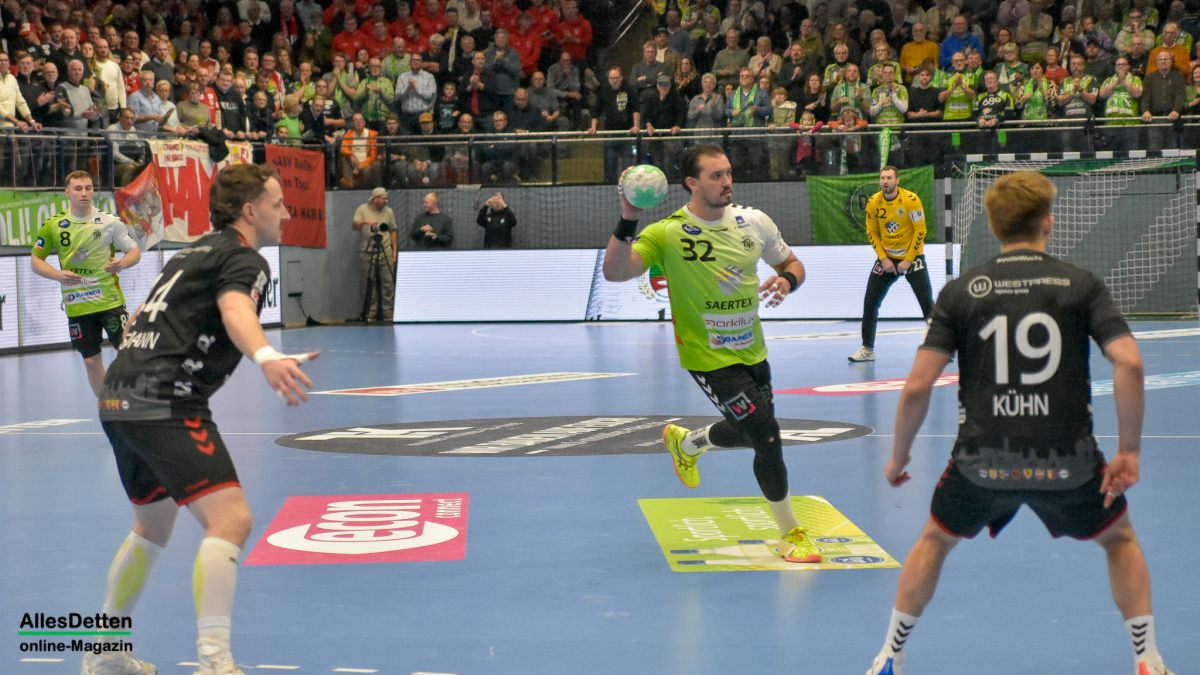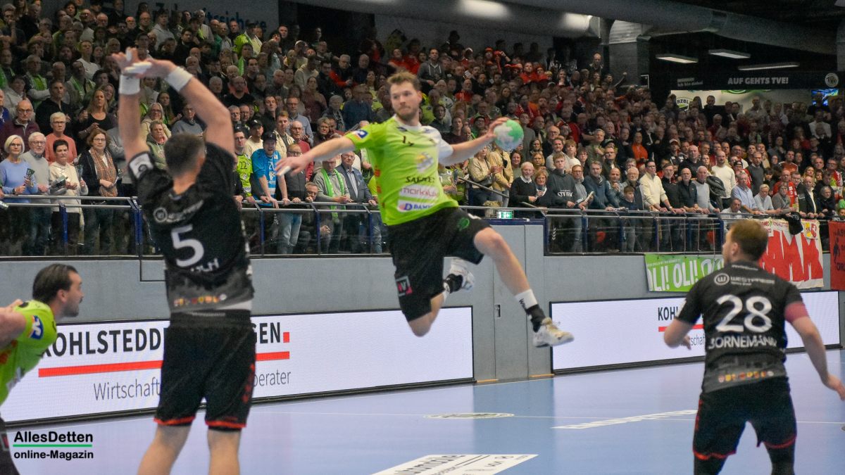 Der zweite Durchgang war das erwartet heiße und umkämpfte Derby in einer mit 2.200 Zuschauern ausverkauften und kochenden EMS-Halle. Wenn der TVE mal wieder etwas weg zog, legte Hamm gleich nach und spielte sich wieder an die Schützlinge von Emsdettens Trainer Lennart Lingener heran. Hier agierten jetzt zwei Teams auf Augenhöhe. Und die schenkten sich nichts! Beim Stand von 28:25 musste Gästespieler Jan Brosch mit seiner dritten Zeitstrafe vorzeitig und unfreiwillig in den Feierabend gehen. Das nutzte Emsdetten um nach Marius Kluwes Treffer zum 31:25 einmal mehr in Führung zu gehen. Kurz darauf war auch für TVE Rückraumspieler Akos Szeles Feierabend. Der Gegenspieler war bereits vorbei als er noch einmal zulangte und dafür die rote Karte sah. Keine böse, aber unnötige Aktion des Ungarns. Der ASV Hamm warf in der Schlussphase noch einmal alles in die Partie und erzwang eine kleine Aufholjagd, die sie noch einmal bis auf zwei Tore auf 34:32 heran brachte. Detten agierte cool, wusste das dem Gegner die Zeit ausging. Mit dem Abpfiff rissen die Spieler die Arme in die Höhe, und die EMS-Halle sang gemeinsam „Oh, wie ist das schön!“ Recht hatten sie: Ein ganz großes Spiel zweier wirklich toller Teams. Und ein Derbysieg für den TV Emsdetten!