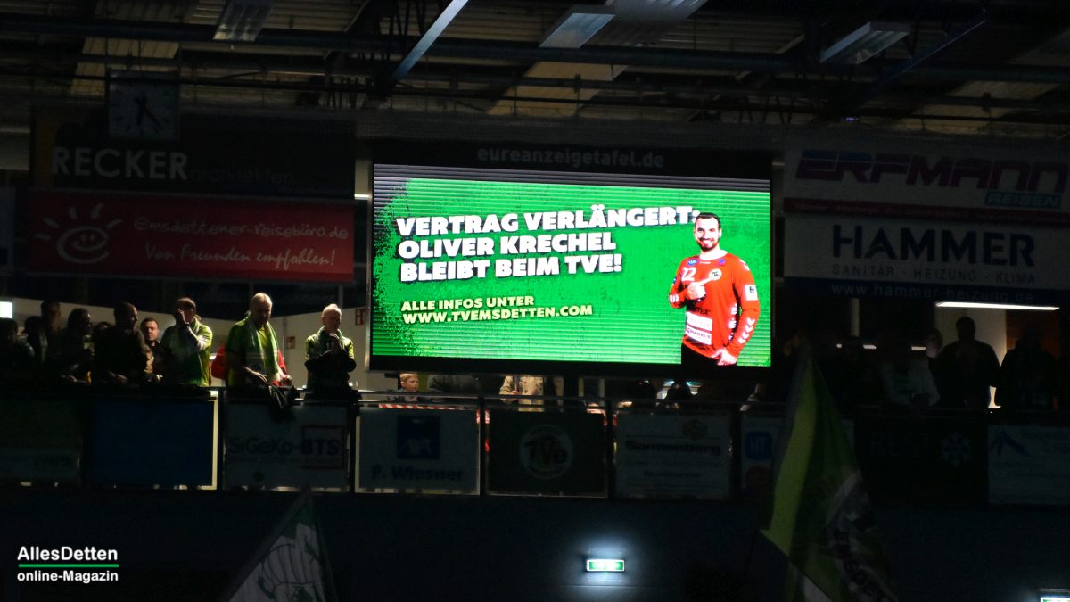 Dass die EMS-Halle eine ganz besondere Stimmung auf die Platte bringen kann ist in Handballdeutschland bestens bekannt. Daran hat auch der Abstieg in die dritte Liga nichts geändert. Nach dem Abstieg im letzten Jahr hat der ASV Hamm sich dazu gesellt und beschert den Handballfans in der Region die Rückkehr des Derbys. Und die Fans beider Lager nahmen das mit dem Anpfiff sofort an: 0:2 aus Emsdettener Sicht, Hamm hatte einen guten Start hingelegt. Der volle Auswärtsblock tobte, da war Stimmung im roten Lager! Die heimischen Fans aus der Emsstadt wollten da natürlich mitgehen und blieben einfach stehen bis Andre Meuser nach drei gespielten Minuten den ersten Emsdettener Treffer anschreiben konnte. Sie setzten sich aber nur kuz: Ein Doppelschlag von Bjarne Budelmann zum 4:2 für den TVE hob die Zuschauer sofort wieder aus den Sitzen und brachte die Halle zum beben. Es sollte nicht die letzte Erruption des Vulkans „EMS-Hölle“ an diesem Abend bleiben.