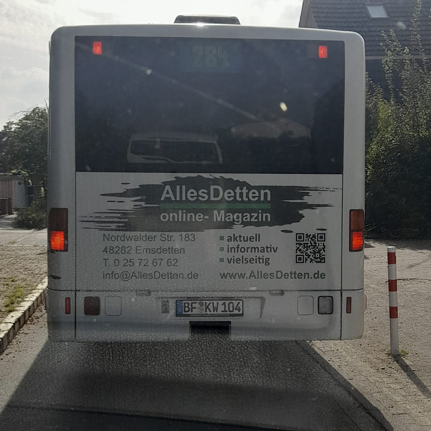 Er fährt fleißig in Emsdetten seine Runden, der AllesDetten-Bus. Gestern erreichte uns wieder ein Foto, aus dem Auto heraus durch die eigene Windschutzscheibe aufgenommen. – Ich gehe ja mal davon aus, dass beide gestanden haben…