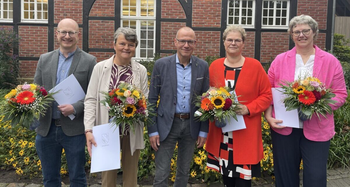 Im Rahmen einer kleinen Feierstunde auf Hof Deitmar am Dienstag, 07. Oktober 2025, gratulierte Bürgermeister Oliver Kellner vier Mitarbeitenden der Stadtverwaltung zu ihren Dienstjubiläen. Oliver Kellner sprach den Jubilaren Petra Büker, Monika Fontein, Marco Löckemann und Marion Niehoff im Beisein von Kolleginnen und Kollegen Dank und Anerkennung für ihre langjährige Tätigkeit im öffentlichen Dienst aus.