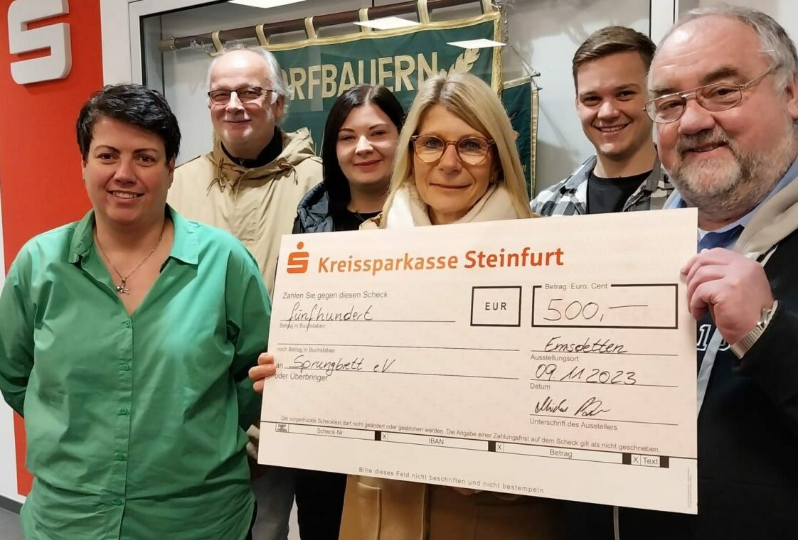 Anlässlich des 100-jährigen Spielmannszugjubiläums der Dorfbauen Schützengesellschaft konnte am vergangenen Donnerstag in der Kreissparkasse Steinfut an der Borghorster Straßeder Festauschuss dem Verein „Sprungbrett e.V.“, vetreten durch Andrea Vogel, eine Spende von 500,00 € überreichen.