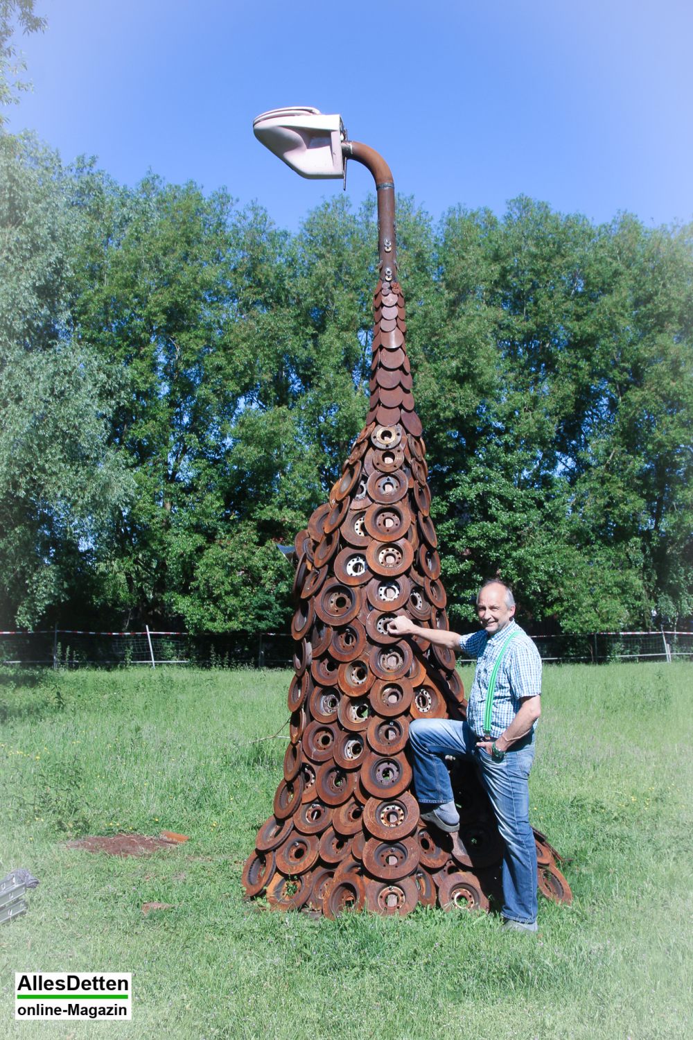 Lange haben die Menschen gerätselt, in den sozialen Medien wurde viel diskutiert seit AllesDetten erstmals (H I E R) im März über die Entstehung einer Skulptur von Franz-Josef Schwegmann berichtete. Damals war lediglich die Unterkonstruktion erkennbar und führte zu vielerlei Spekulationen. Die zahlreichen Zaungäste, die tagtäglich an der Nordwalder Straße Augenzeuge des fortschreitenden Werkes wurden, konnten ihre Ideen auf einem bereit liegenden Block niederschreiben oder auch im Gespräch mit dem Künstler verbal sinnieren, was da entsteht. Fünf Meter hoch und etwa zwei Tonnen Gesamtgewicht sind schon extreme Ausmaße.