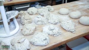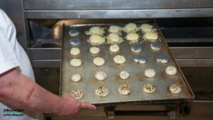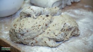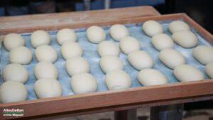 Während die Teiglinge für die „normalen“ Brötchen maschinell geformt werden, dann für 24 Stunden in die Reifekammer geschoben werden, werden die Eigenkreationen wie Schwedenbrötchen, Wikinger, Mixies, Tiger oder Römer, Fitneß-Brötchen… allesamt von Hand in Form gebracht. „Jeder Bäcker hat da seine eigenen Rezepturen.“, verrät uns Völker, der die Zusammensetzung der 38 verschiedenen Brötchensorten, die er in dem Umfang jedoch nur am Wochenende im Angebot hat, selbst entwickelt und ausprobiert hat.