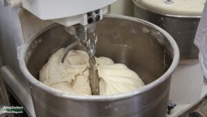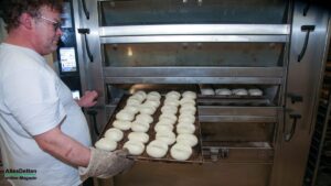 Um kurz nach drei Uhr wird der erste „Sticken“ in den Ofen geschoben, ein Wagen mit 600 Brötchen, 17 Minuten bei 180°C. Um sechs Uhr ist dann auch die Auslage in der Hauptstelle im Elefanten-Cafe bestückt. 1.700 bis 2.000 kg Mehl werden jede Woche verbacken.