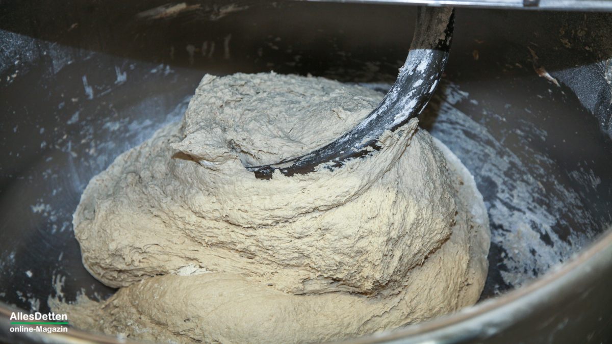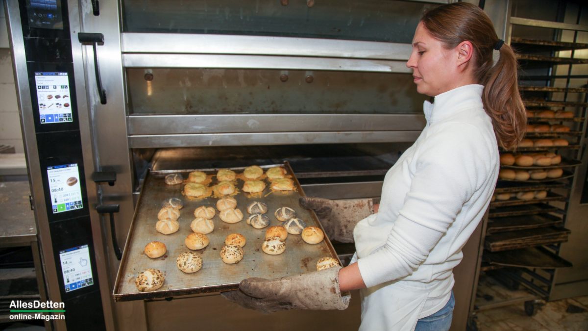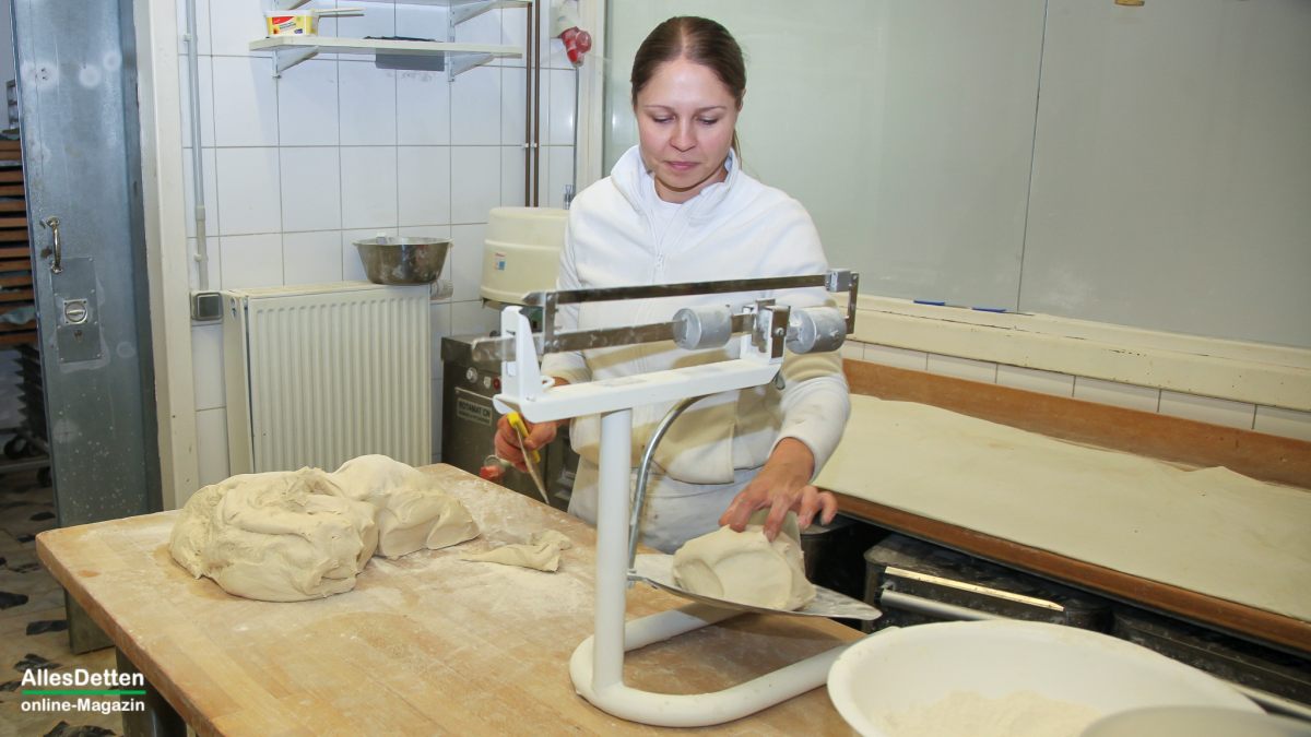 Die Brötchen warten in einem der beiden Öfen, die im Dauerbetrieb arbeiten, darauf, dass sie goldbraun und knusprig werden, als Elena Geist-Diestel die vielen verschiedenen Brote vorbereitet. Genau abgewogene Zutaten werden in der Knetmaschine vermengt, anschließend von Hand in Form gebracht. Elena Geist-Diestel hat 2009 bei Völker die Bäckerinnenlehre begonnen, nach der Lehre wurde sie übernommen und ist seitdem als Gesellin hier beschäftigt.