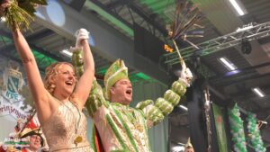 Prinzenpaar, Stadtelferrat, die Saalprinzen, Stadt-Jubelprinzenpaar Paul und Petra Müllmann, Tanzgarde, Prinzengarde, Stadtgarde, KGE-Vorstand waren auf der Bühne angekommen Unter ihnen auch das Stadtprinzenpaar 2025, Jochen und Marion Hentschel. Für die beiden war jetzt die Stunde des Abschieds gekommen, „Abschied von einer grandiosen Session!“, wie Jochen I. betonte und sparte nicht mit einer langen Liste an persönlichen Dankesworten.