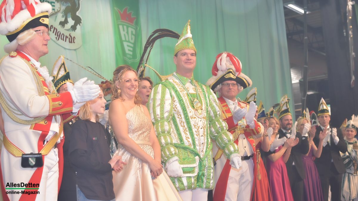 Dann kam der Moment, auf den alle gewartet hatten. „Wohl keiner hier im Saal kann von sich behaupten, dass ein alter Karnevalsschlager so zutreffend ist, wie der (noch bürgerliche) Tobias Tecklenborg,“ Damit gab KGE-Prasident Martin Mersmann für einen Sekundenbruchteil die Möglichkeit des Widerspruchs und löste auf: „Am Rosenmontag bin ich geboren…“ Rosenmontag 1984 war der Tag an dem Tobias das Licht der Welt erblickte. Heute erhält er das Zepter von Vorgänger Jochen I. und ist fortan Prinz Tobias I. von Dottland!