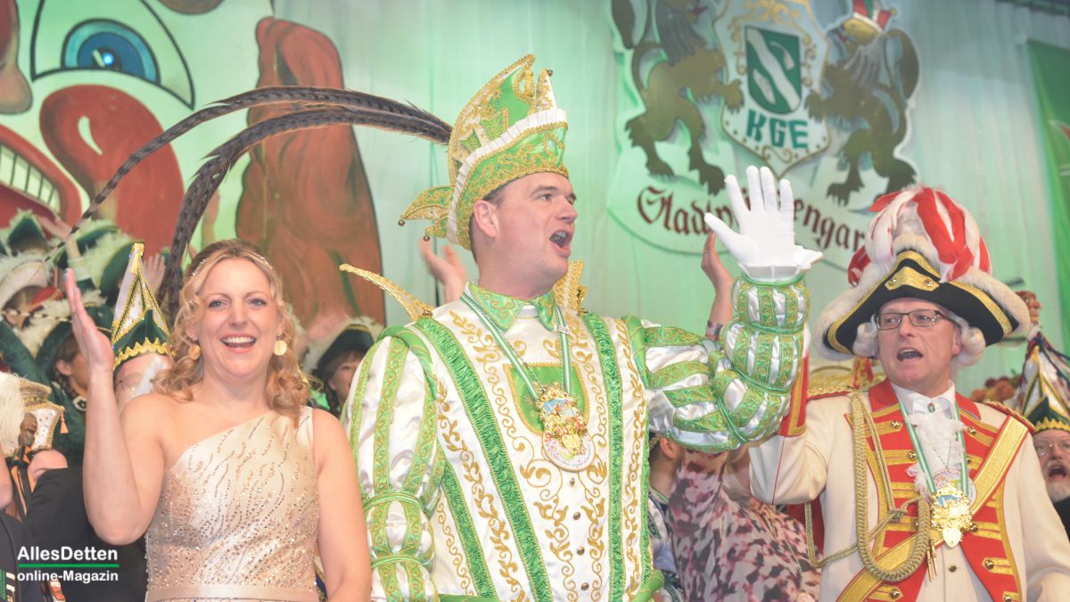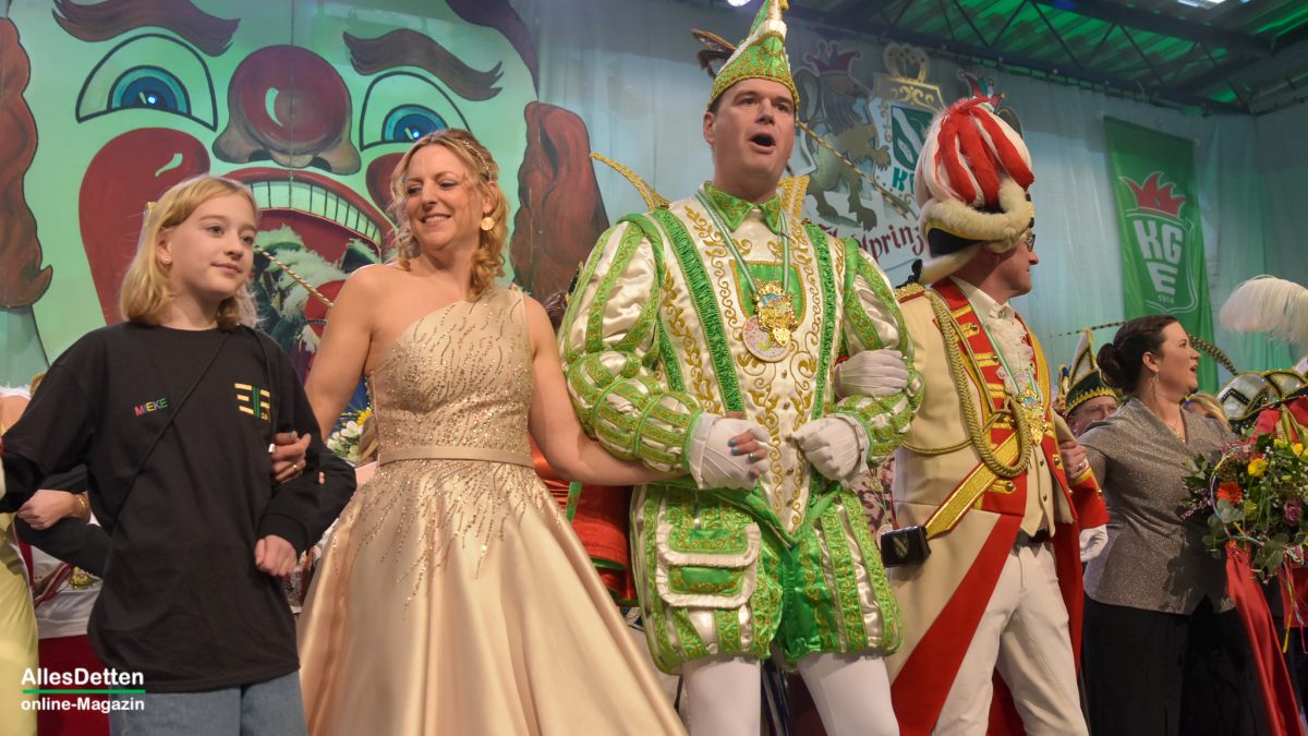 „…er ist Stadtprinz von Detten der Tecky, immer hop, immer top, alles klar!“ So lauteten die Anfangszeilen des Prinzenliedes 1995 von Tecky I. – Kaum treffender hätte man es für die Proklamation gestern in der EMS-Halle bezeichnen können: „Für Tobias I. Tecklenborg (Tecky II.) erfüllt sich definitiv ein Traum, – für Prinzessin Jessica I. ist diese Schnapsidee Stadtprinz erst in den vergangenen Tagen und Wochen zum Traum geworden, aus dem sie jetzt nicht mehr aufwachen möchte!“, mit dieser Feststellung begrüßten die KGE-Präsidenten Martin Mersmann und Thomas Weischer das Prinzenpaar dann endlich auf der Bühne vor fast ausverkaufter Halle.