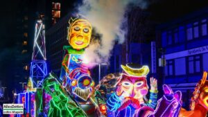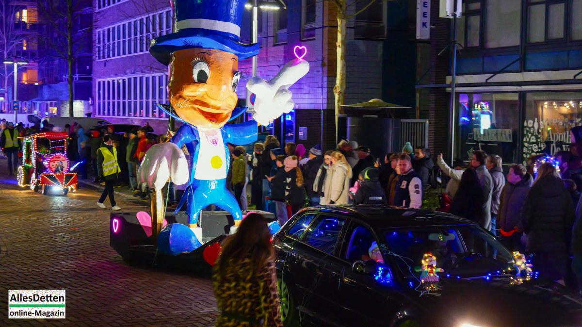 Der Stadtelferrat 2025 im Prinzenpaar Jochen und Marion Hentschel waren in diesem Jahr der Einladung von Hengelos Bürgermeister Sander Schelberg gefolgt. Aus Emsdetten waren neben Bürgermeister Oliver Kellner, 1. Beigeordnetem Elmar Leuermann, den ehemaligen Prinzen Michael Jürgens, Andre Jürgens und Dieter Rengers und einigen KGE-Wagenbauern weitere Interessierte an Bord des von Christoph Hemesath geführten Busses. Bis zu sieben Meter Höhe dürfen die festen aufbauten der Zugnummern haben. Dann darf die Figur noch bis auf acht Meter ausgefahren werden. Viel Licht und Bewegung ist eigentlich selbstgestecktes Ziel der Vereine. Nach jedem Beitrag geben die Juroren ihren Bewertungsbogen ab. Die Auswertung erfolgt direkt im Anschluss der Lichtparade. „Über 100.000 Lichter!“ hieß es vom Veranstalter – gefühlt waren es WEIT über 100.000.