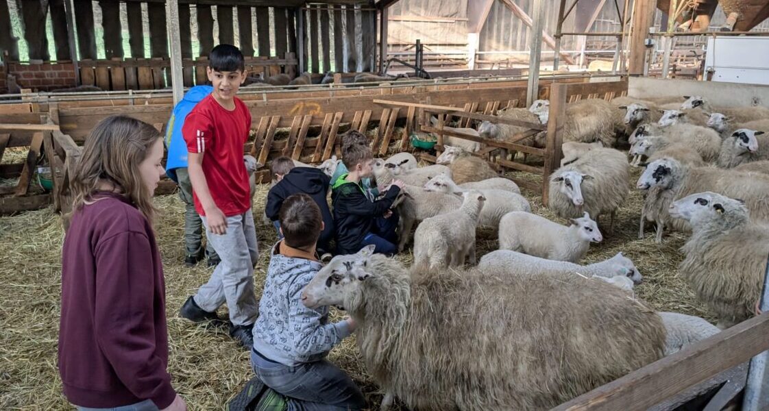 Vor Ort begrüßte Nina Bramm von der ANTL die Gruppe und erklärte den Gästen den Umgang mit einer Herde. Diese besteht dort derzeit aus rund 400 Schafen. Die Kinder konnten beim Füttern zusehen und sogar selbst mithelfen. Viele der Schülerinnen und Schüler suchten während des Besuchs die Nähe zu den Tieren, setzten sich ins Stroh und kamen besonders mit den Lämmern in Kontakt – eine Erfahrung, die auf die Kinder spürbar beruhigend wirkte und ihnen einen unmittelbaren Zugang zu den Tieren ermöglichte.