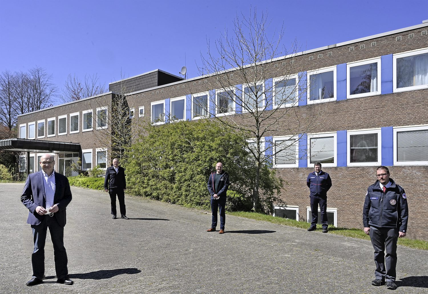 Das Fieberlazarett in Laer ist jetzt geräumt worden. Das nahmen Landrat Dr. Martin Sommer, Dr. Karlheinz Fuchs (Leiter der Stabsstelle Corona und designierter Dezernent für Gesundheit und Bevölkerungsschutz des Kreises Steinfurt), Kreisbrandmeister Raphael-Ralph Meier sowie Marvin Lembeck vom Kreis Steinfurt zum Anlass, sich für die sehr gute Kooperation mit den Hilfsorganisationen Deutsches Rotes Kreuz sowie Malteser Hilfsdienst e.V. sowie bei Laers Bürgermeister Manfred Kluthe und Pfarrer Andreas Ullrich vom Kuratorium Stiftung Marienhospital zu bedanken.