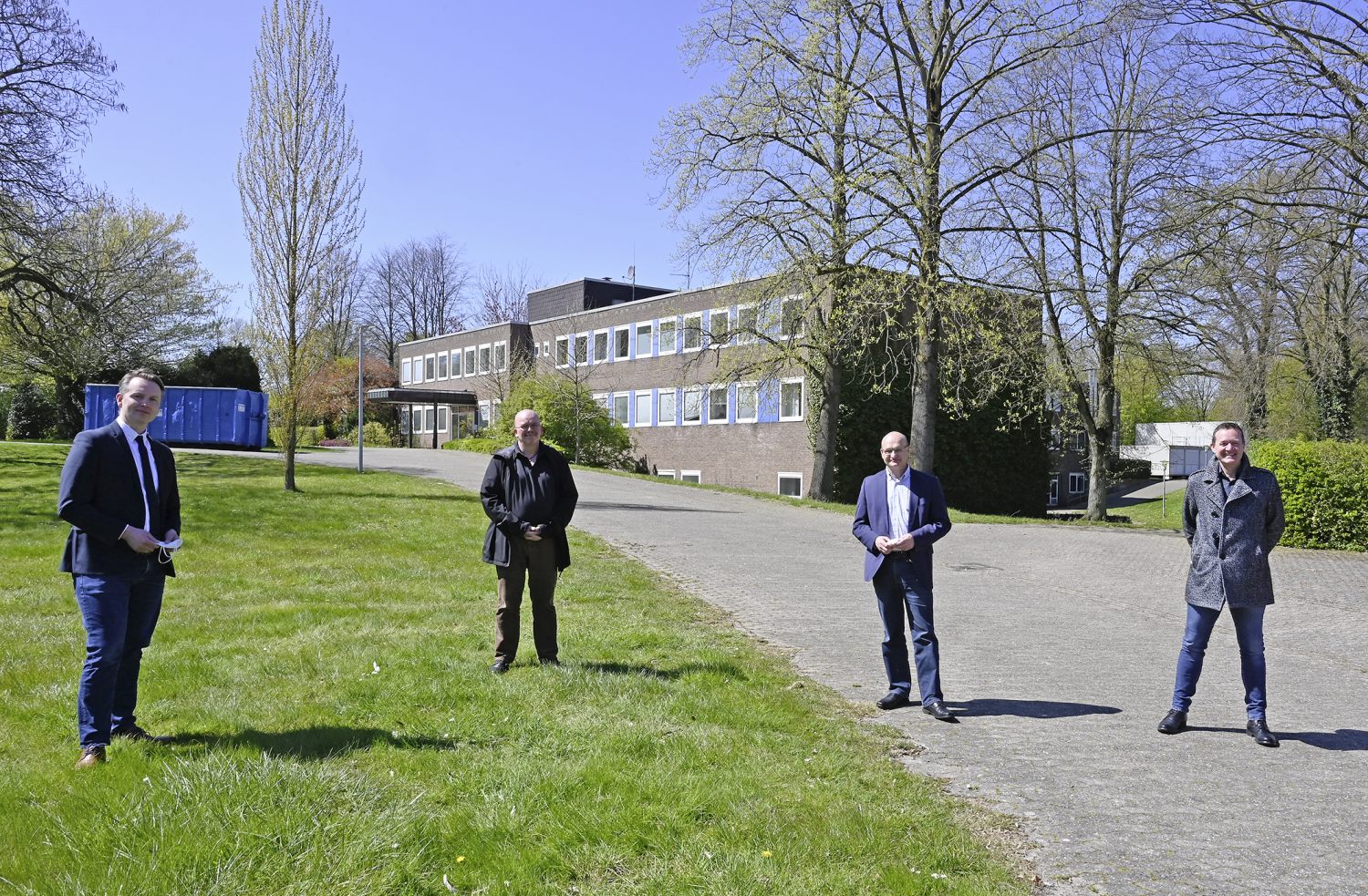 Landrat Dr. Martin Sommer (2.v.r.) und der Leiter der Stabsstelle Corona, Dr. Karlheinz Fuchs (r.), bedankten sich auch bei Laers Bürgermeister Manfred Kluthe (l.) und Pfarrer Andreas Ullrich (2.v.l.) vom Kuratorium Stiftung Marienhospital. (Foto: Dorothea Böing, Kreis Steinfurt)