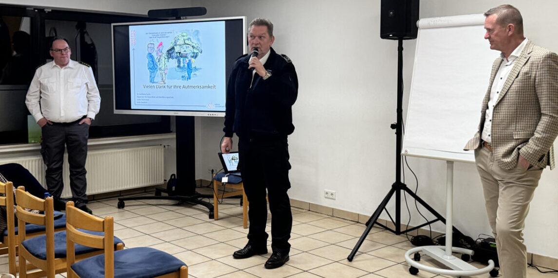 Im Mittelpunkt stand der Vortrag von Dr. Karlheinz Fuchs, Dezernent für Gesundheit und Bevölkerungsschutz sowie Leiter des Krisenstabs des Kreises Steinfurt. Anschaulich und eindringlich erläuterte er, wie Behörden, Hilfsorganisationen und Kommunen im Ernstfall zusammenarbeiten und welche Strukturen im Hintergrund greifen.