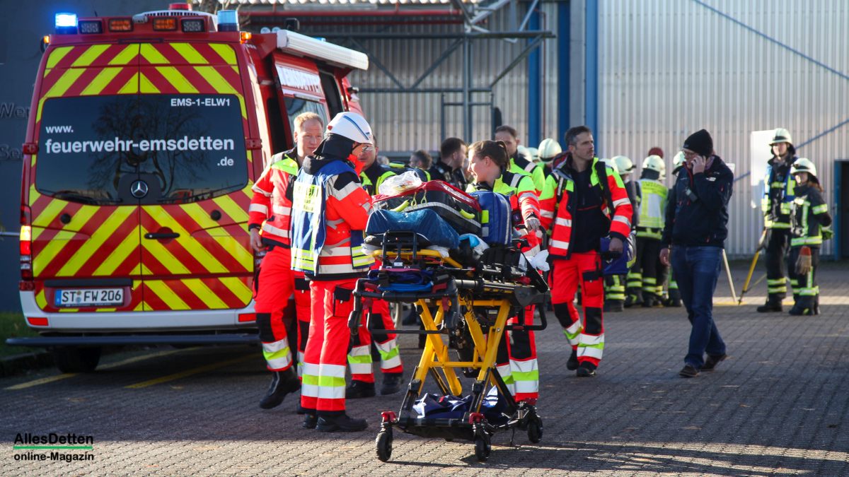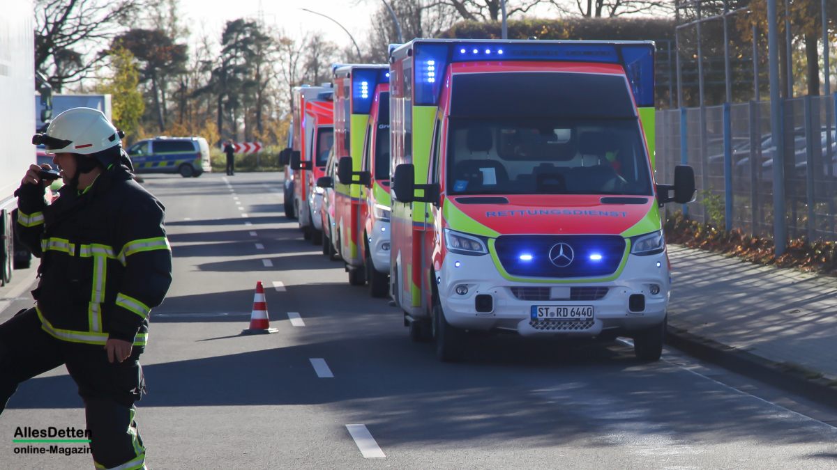 Um 11:20 Uhr hieß die Meldung, die bei uns einging, noch ManV10 = Massenanfall an Verletzten 10 Personen. Um 11:31 Uhr wurde nachalarmiert und wie Wehrführer Willi Kemper vor Ort im Gespräch mit AllesDetten mitteilte, sind tatsächlich 40 Personen betroffen.