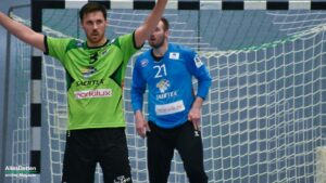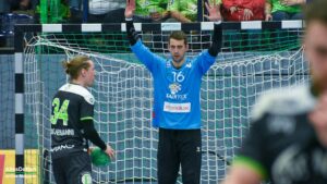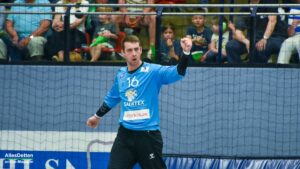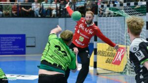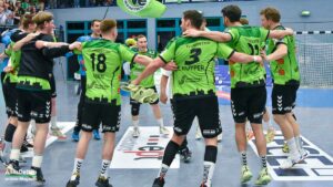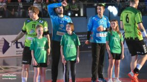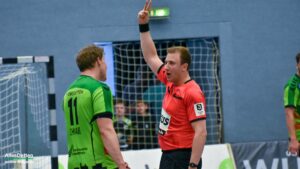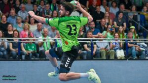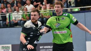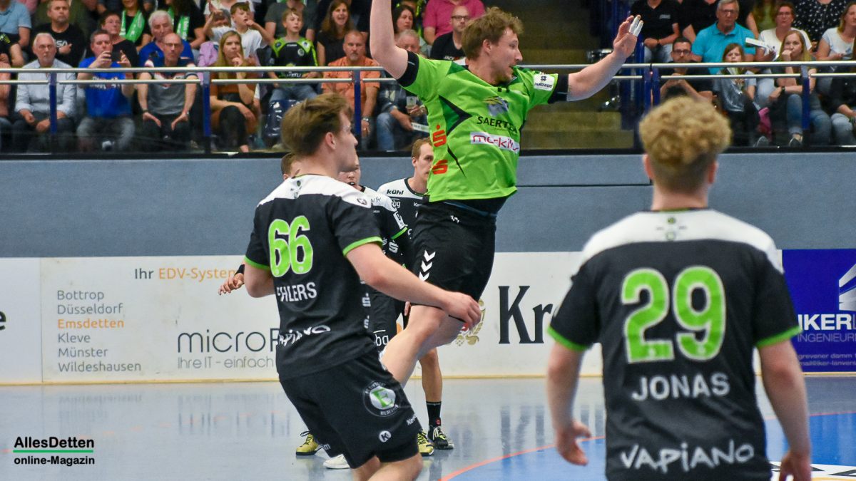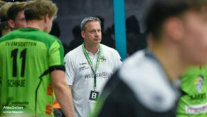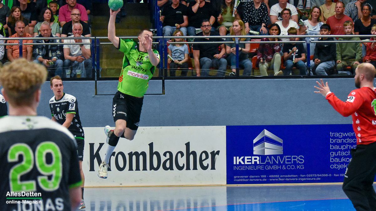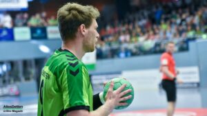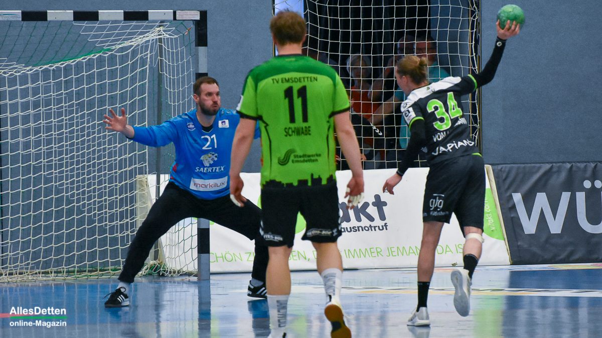 Nach dem Seitenwechsel kam Ante Vukas in das TVE Tor. Der war heute ein Garant dafür, dass der TVE jetzt davon zog. Ganze 12 Tore konnte Vukas in den zweiten 30 Minuten verhindern. Seine Vorderleute hatten richtig Lust aufs Tore werfen. Beste Torschützen waren auf Emsdettener Seite Rechtsaußen Yannick Terhaer mit fünf, sein Kollege auf Linksaußen Paul Kolk mit acht und der heute wieder in Angriff und Abwehr überragende Robin Jansen mit neun Treffern. „Robin ist für uns einfach ein ganz wichtiger Faktor.“ attestierte ihm sein Trainer nach der Partie. „Wir konnten dann ab Minute 45 wechseln, das gibt uns die Möglichkeit Leute wie Jakob Schwabe oder Robin Jansen zu entlasten. Die spielen einfach zu oft über 60 Minuten, wir schauen auch im Training bei den Spielern schon, dass wir die Belastung bei ihnen so weit wie möglich reduzieren.“ Die Wechselmöglichkeiten beim TV Emsdetten sind tatsächlich ein Faktor, der in den verbleibenden drei Partien noch ganz wichtig werden könnte. Ganz wichtig könnte am Ende der Aufstiegsrunde auch die Tordifferenz werden! Auf der Pressekonferenz darauf angesprochen, ließ Sascha Bertow nur ein „Darüber sprechen wir nicht“ über seine Lippen kommen. Verständlich, denn wenn sein Team die restlichen Partien gewinnt muss sie sich überhaupt nicht damit befassen.