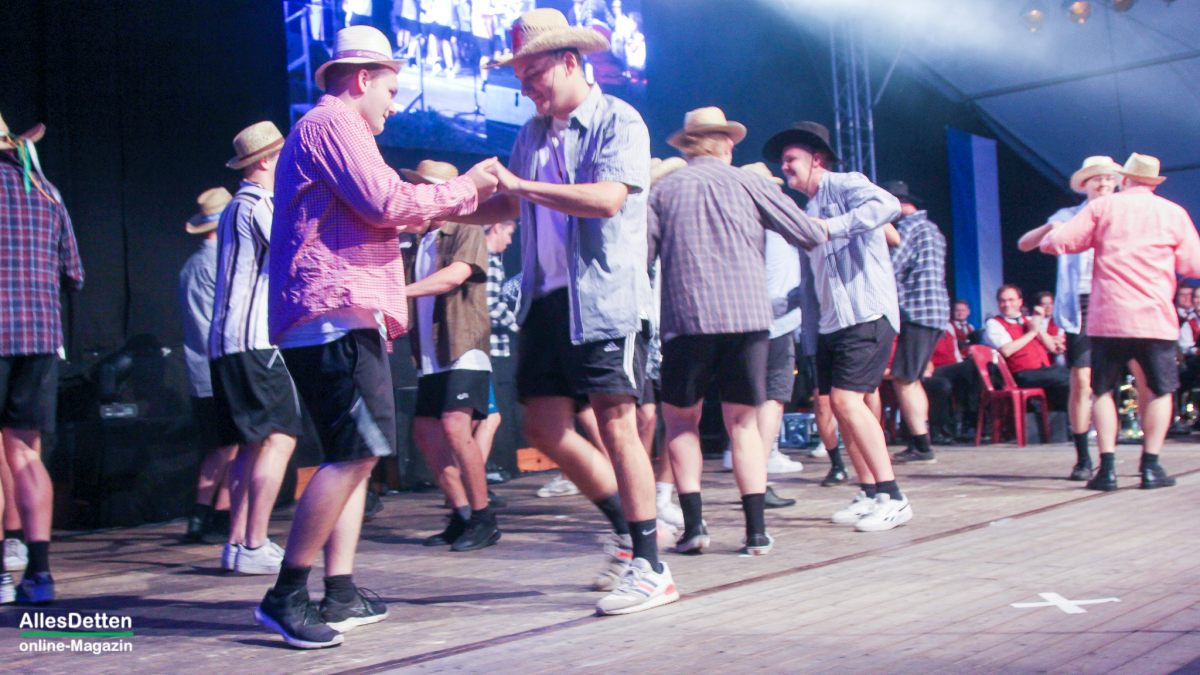 Wer glaubte, er könne sich jetzt wieder hinsetzen, lag falsch, im Gegenteil, für einige ging es gar eine Etage höher, – auf die Stühle. Die Ahlinteler Jugend hat sich in der Filmszene umgesehen und einige solche nachgestellt, startete gleich mit einem Klassiker: die Hebefigur aus Dirty Dancing.