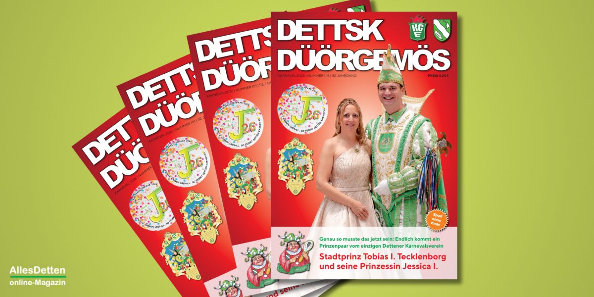 Die neue Karnevalszeitung liegt druckfrisch bereit, Dettsk Düörgemös 2026 ist fertig, kann ab heute erworben werden. Die Schützenvereine werden ihre vorab bestellte Menge ab 8 Uhr auf dem Parkplatz neben Graute Beik in Empfang nehmen, nur wenig später starten die Clownläufer der Gesellschaften in den eingeteilten Wohngebieten mit dem Verkauf.