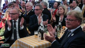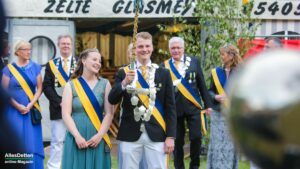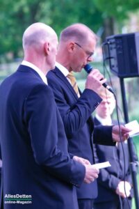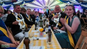 Wie auch schon zuvor bei der Kranzniederlegung am Ehrenmal erwähnt, waren sie froh, nach den vergangenen zwei pandemiegeprägten Jahren endlich wieder feiern zu können, bis dann im Februar der unfassbare Überfall Rußlands auf die Ukraine und der dadurch mitten in Europa entfachte Krieg die Vorbereitungen ins Stocken geraten ließ. Doch letztlich hat man sich dazu durchgerungen, die Veranstaltungen zu planen und duchzuführen. Der Zuspruch des Publikums gab ihnen Recht. Das Festzelt musste erweitert werden, beim Kommers waren allein 750 geladene Gäste anwesend. Die 40 Gastvereine werden heute ca. 2.000 Schützenbrüder und -schwestern in den Festzügen marschieren lassen und bei dem Wetter wird mit mindestens nochmal der gleichen Zahl weiterer Festbesucher gerechnet.
