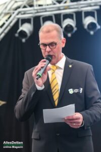Bürgermeister Oliver Kellner überbrachte neben seinen persönlichen Glückwünschen auch die von Rat und Verwaltung der Stadt Emsdetten. Ihn persönlich verbindet mit Austum, dass er vor vielen Jahren auf deren Schützenfesten gekellnert hat. Darüber hinaus in Diensten eines Getränkeunternehmens gleich mehrfach in einer Nacht für Nachschub sorgen musste.